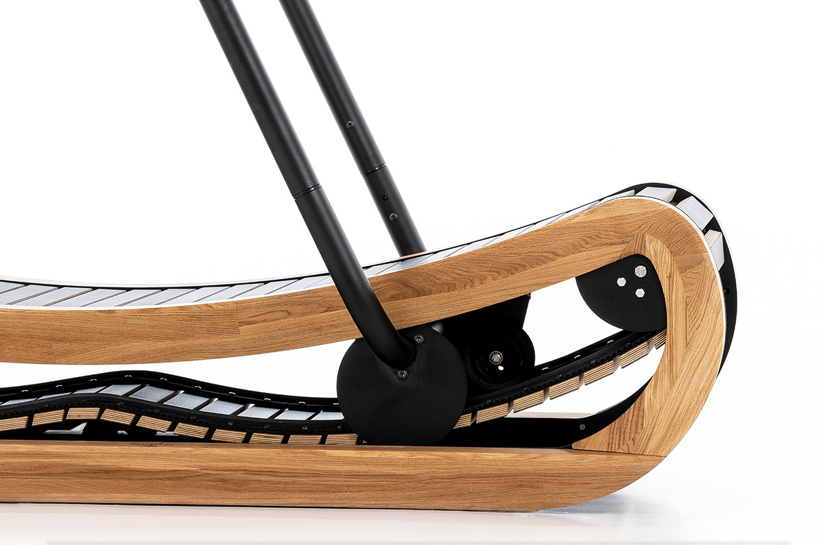 - Gładka rama z litego drewna – najbardziej estetyczną cechą bieżni Sprintbok NOHRD jest gładka, zakrzywiona rama wykonana z litego, twardego drewna. Funkcjonalna drewniana rama przyczynia się do redukcji drgań podczas pracy.