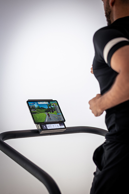 Bieżnia w zestawie z monitorem i tabletem treningowym V2 oraz torbą do przechowywania akcesoriów.