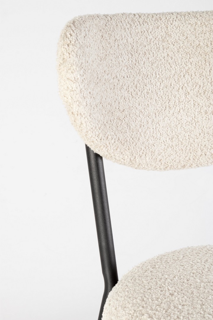 Siedzisko i oparcie wykończone tkaniną o efekcie bouclé oraz wypełnione pianką poliuretanową zapewniają doskonały komfort, trwałość oraz idealne dopasowanie do kształtu ciała, zachowując przy tym swoją formę przez długi czas.