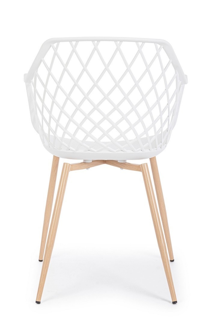 BIZZOTTO krzesło OPTIK białe. Krzesło OPTIK to połączenie nowoczesnego designu z subtelnym nawiązaniem do klasyki. Siedzisko wykonane z trwałego polipropylenu jest odporne na uszkodzenia i doskonale sprawdza się w codziennym użytkowaniu. Stabilna, metalowa podstawa z wykończeniem imitującym drewno nie tylko zapewnia trwałość, ale także wprowadza naturalny akcent do wnętrza. Ażurowe oparcie, inspirowane formą plecionki, dodaje lekkości całej konstrukcji i podnosi komfort siedzenia. Biel siedziska w zestawieniu z jasnymi, drewnopodobnymi nogami podkreśla prostotę i uniwersalny charakter projektu. Model idealnie odnajduje się zarówno w kuchni i jadalni, jak i w przestrzeniach komercyjnych czy biurowych. Dostępny w różnych wersjach kolorystycznych, znajdź idealny wariant dla swojego wnętrza. Wymiary: wys. 85,5 cm / szer. 58 cm / gł. 54 cm Waga brutto: 5,31 kg.