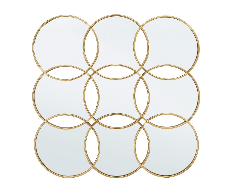 Rama z metalu w odcieniu złota wprowadza do wnętrza luksusowy akcent, a geometryczne zestawienie luster tworzy efektowną ozdobę na ścianie.