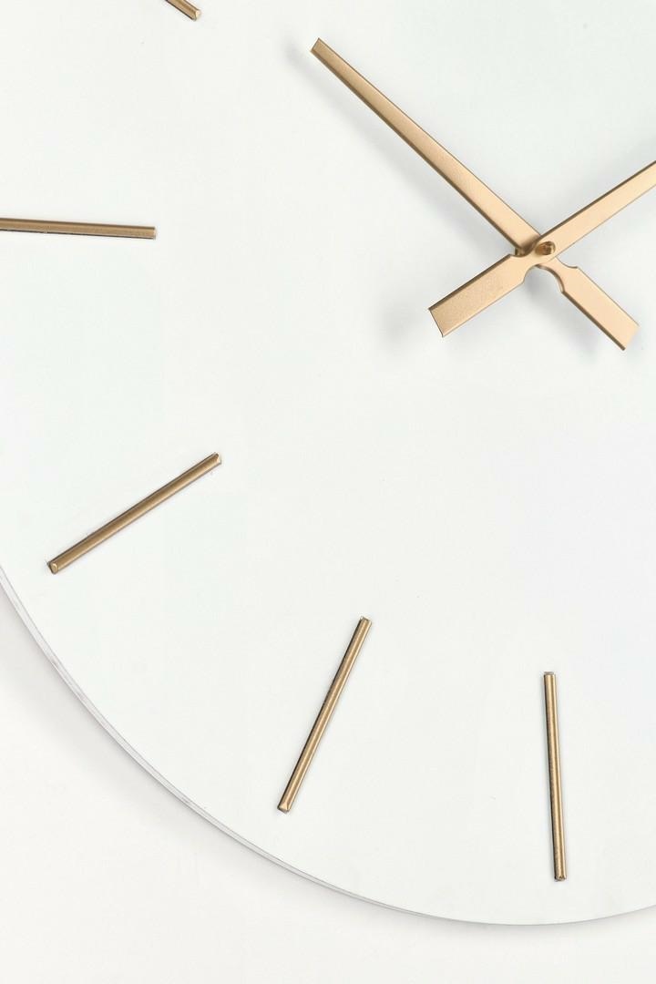Biała tarcza z MDF tworzy wyraźny kontrast ze złotymi wskazówkami i delikatnymi oznaczeniami godzin, dodając elegancji i szyku.