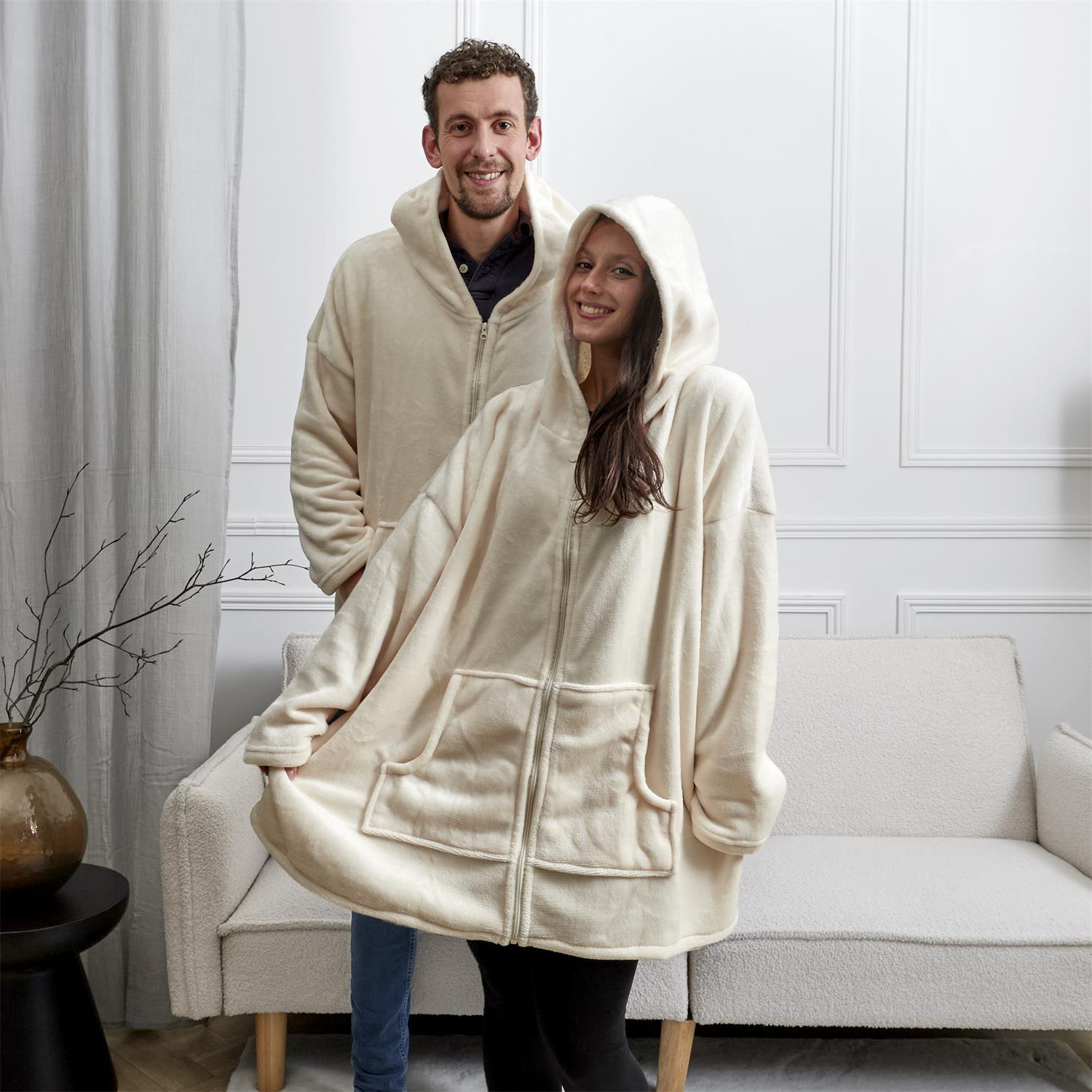 Długa bluza sherpa z suwakiem to idealne nakrycie na długie, zimowe wieczory. Bluza snuddie wyposażona została w kaptur ze ściągaczem oraz kieszenie z przodu. Bardzo miły i ciepły w dotyku materiał gwarantuje długie komfortowe wieczory filmowe. Prać w temp max 30 stopni. Nie prasować. Gramatura tkaniny 385g/m2 tkanina 100% poliester