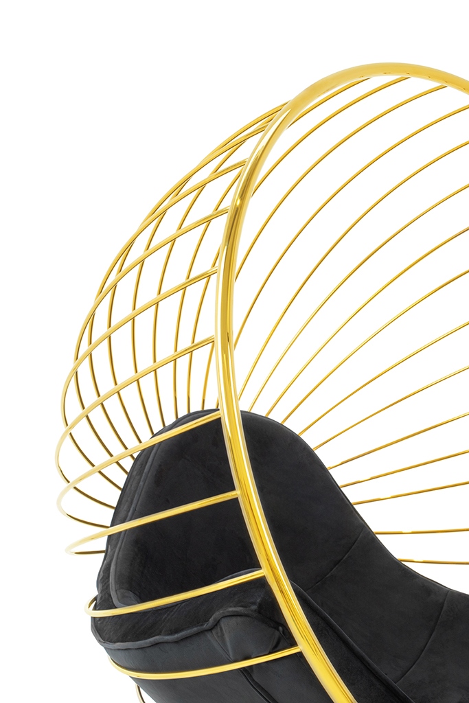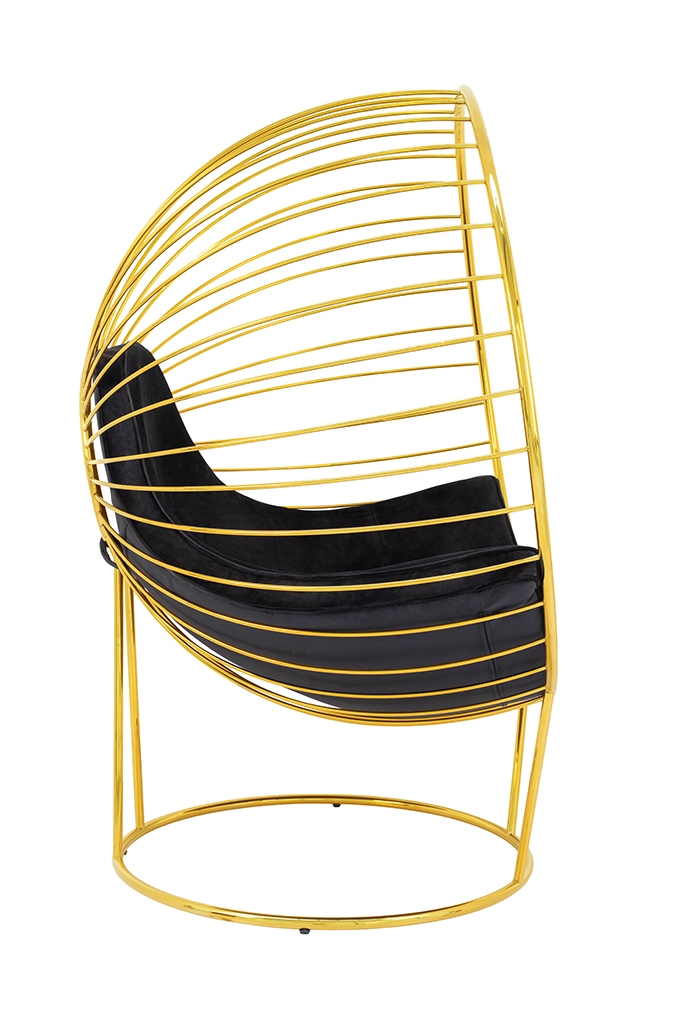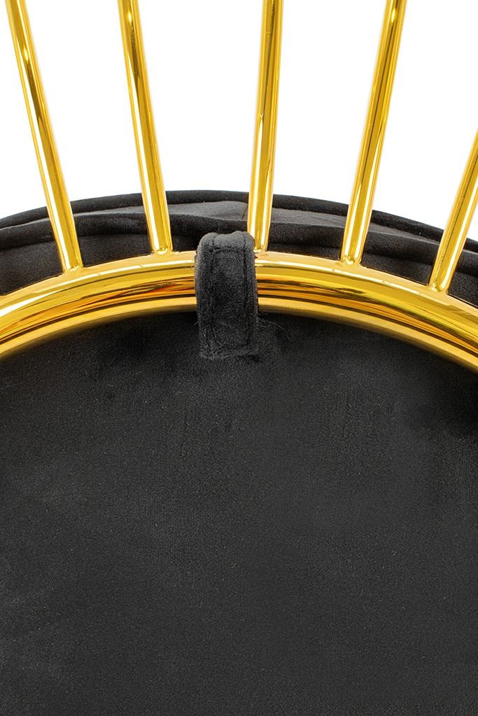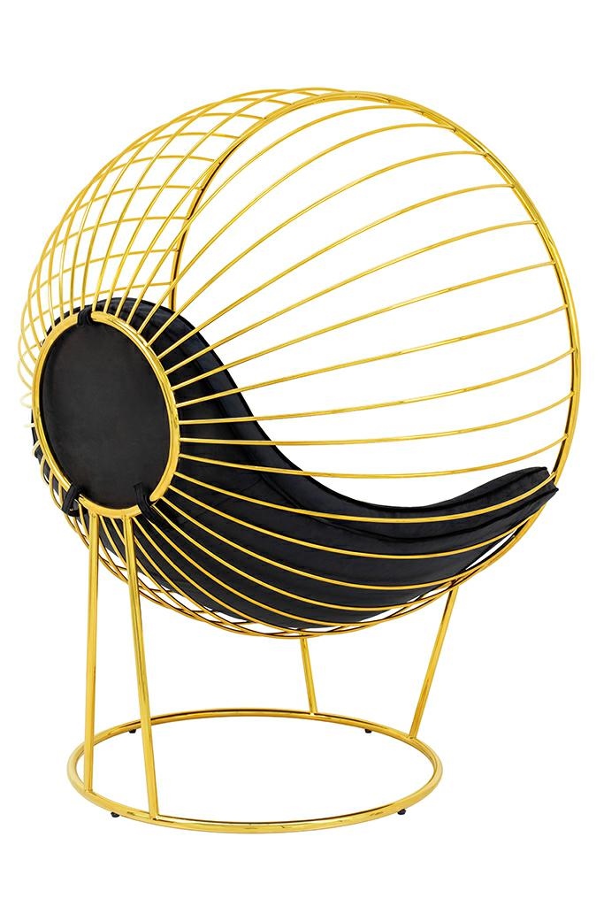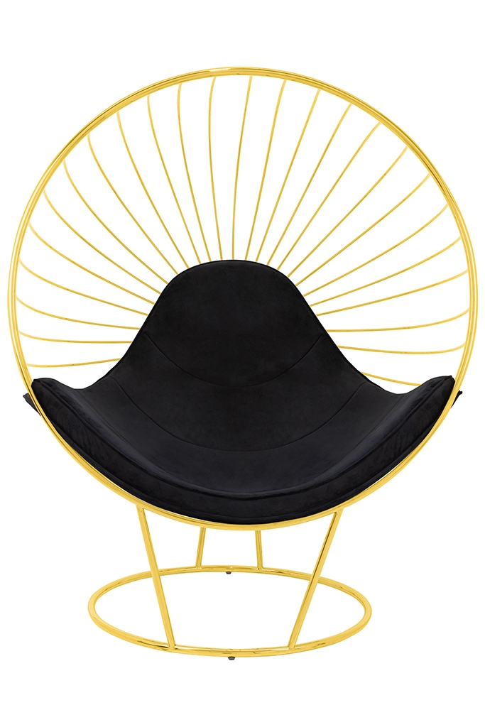 Stelaż fotela wykonany został z metalu lakierowanego na kolor złoty. Korpus kształtem przypomina rozpromienione słońce z ciekawym motywem.