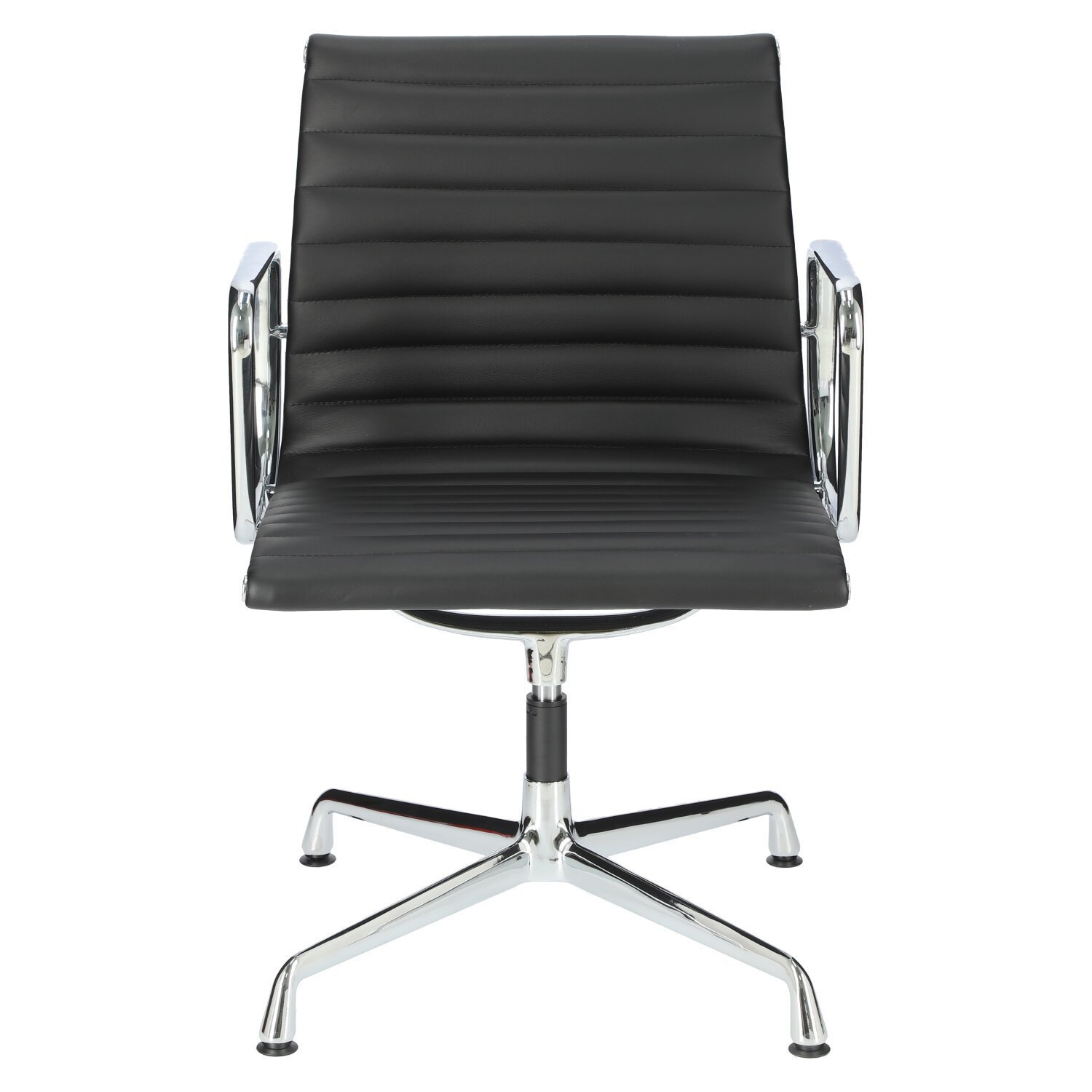 Fotel konferencyjny to nieodzowny element każdej sali konferencyjnej. Fotel CH1081T to przede wszystkim wysoka jakość wykonania oraz ponadczasowy design. Głównym założeniem tego fotela była lekkość formy i wygoda użytkownika. Dlatego materiał, na którym się siedzi jest zawieszony w powietrzu między dwoma metalowymi profilami. Siedzisko zostało zrobione ze skóry ekologicznej w czarnym kolorze. Poziome przeszycia na siedzisku dodają fotelowi klasyczny wygląd. Chromowane elementy fotela dodają całości eleganckiego wyglądu. Obrotowa baza na nóżkach wykonana jest również z chromowanego metalu. Krzesło nie posiada mechanizmu regulacji wysokości.