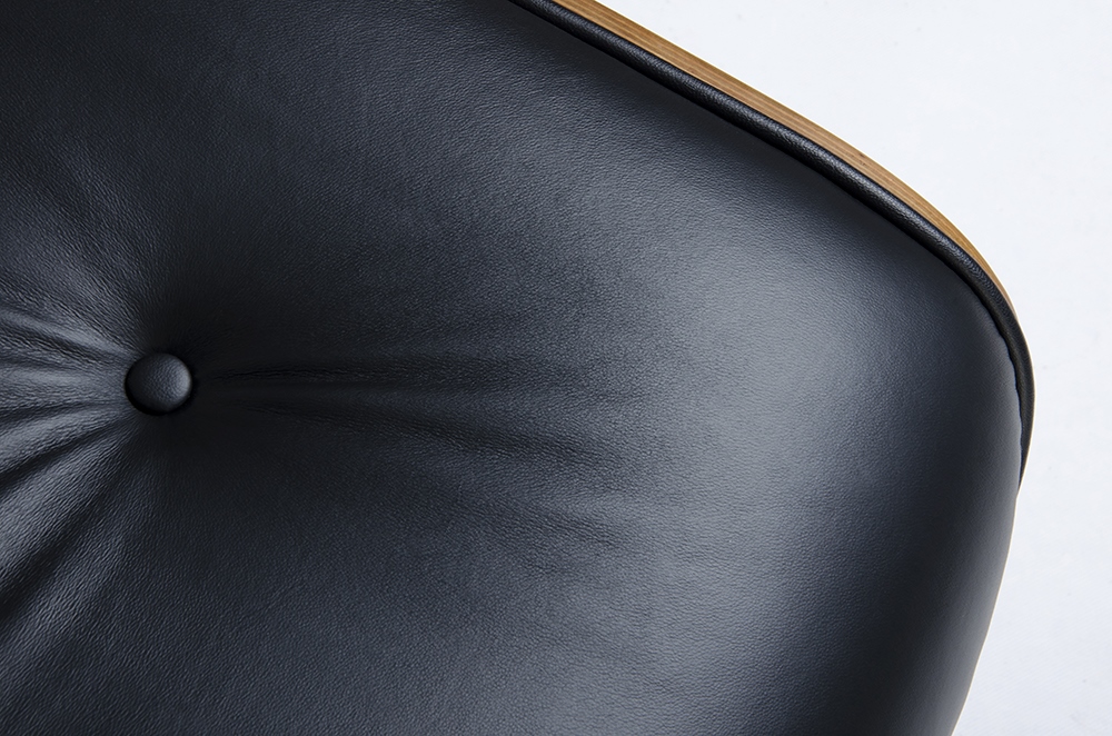 Cały fotel wraz z podnóżkiem tapicerowane są skórą naturalną w kolorze czarnym. Zarówno korpus fotela jak i podnóżka został wykonany z giętego