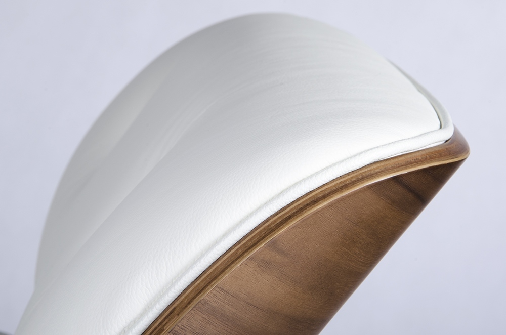 Cały fotel wraz z podnóżkiem tapicerowane są naturalną włoską skórą w kolorze czarnym. Zarówno korpus fotela, jak i podnóżka zostały wykonane