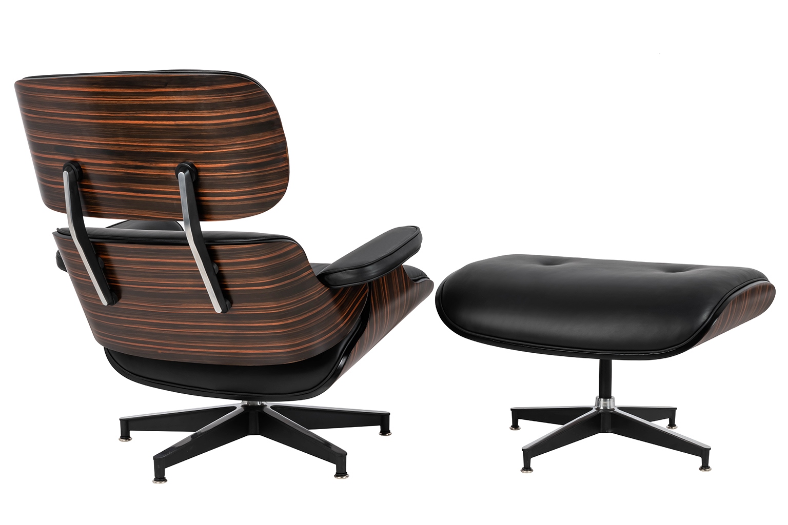 Cały fotel wraz z podnóżkiem tapicerowane są naturalną włoską skórą w kolorze czarnym. Zarówno korpus fotela jak i podnóżka został wykonany