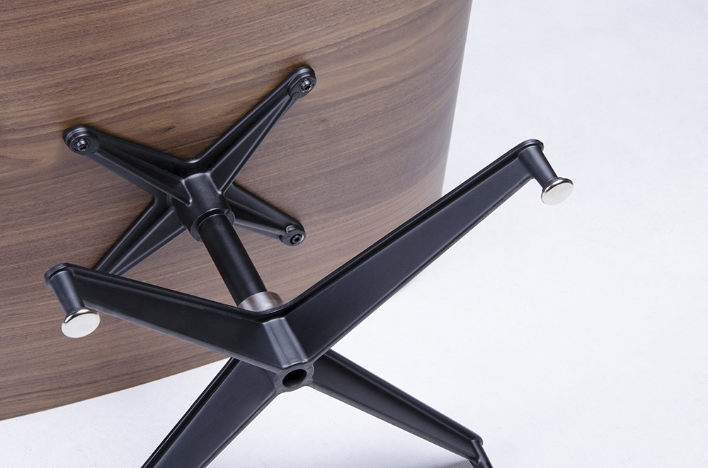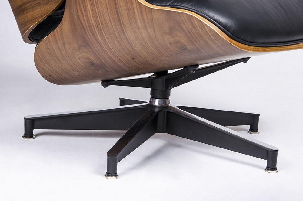 Cały fotel wraz z podnóżkiem tapicerowane są naturalną włoską skórą w kolorze czarnym. Zarówno korpus fotela jak i podnóżka został wykonany