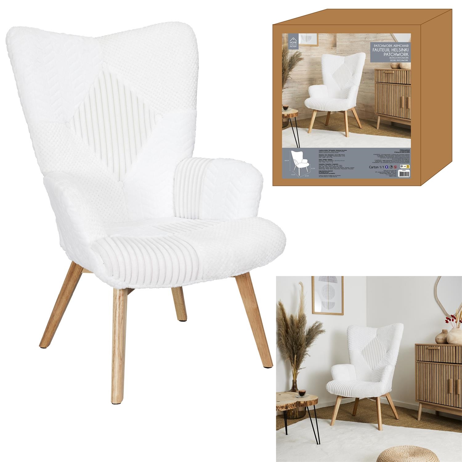 Wygodny fotel uszak w białej patchwrkowej tkaninie to mebel zarówno do spokojnego wypoczynku jak i do czytania książek lub karmienia piersią. Fotel o niskim siedzisku z głębokim oparciem gwarantuje wyciszenie oraz komfort. Fotel na drewnianych, toczonych, kauczukowych nóżkach w kolorze cnaturalnym idealnie pasuje do wnętrz w stylu nowoczesnym, boho, japandi jak i skandynawskim. Ozdobna, biała tkanina wykonana z 100% poliestru została ozdobiona geometrycznymi przeszyciami. Fotel waży 9 kg. Max. obciążenie fotela 120kg. Wymaga łatwego montażu (dokręcenie nóg). Nie sztapluje się. Nie nadaje się do użytku na zewnątrz. Grubość pianki na siedzisku 28kg/m3. Grubość pianki na oparciu: 24kg/m3
