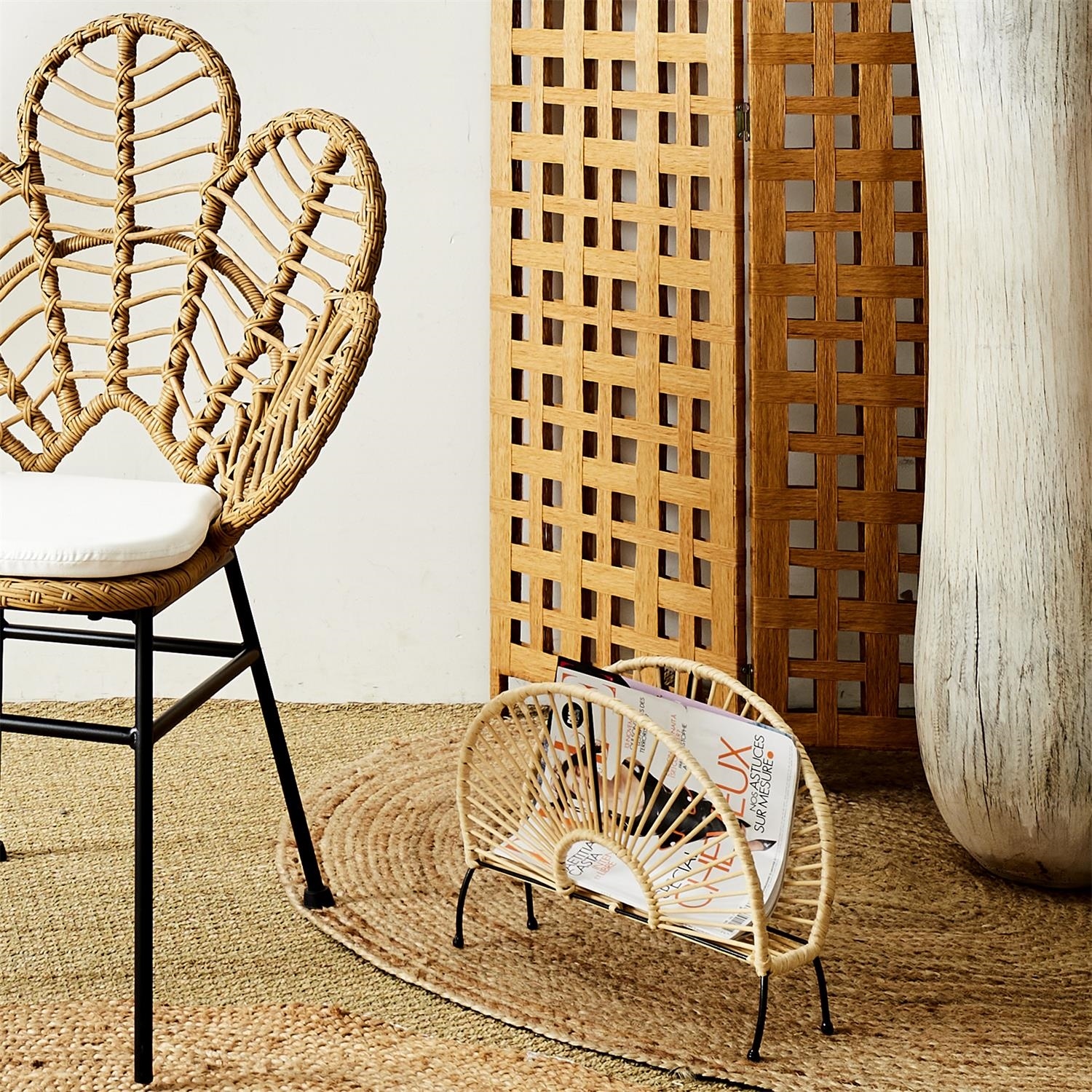 Stojak na gazety z efektem rattanu to nie tylko praktyczny dodatek do Twojego wnętrza, ale również stylowy element dekoracyjny, który z pewnością przyciągnie uwagę i zachwyci Twoich gości. Idealny do salonu, biura, sypialni czy poczekalni. Doskonale organizuje i przechowuje gazety, czasopisma, książki lub inne materiały drukowane. Regularne odkurzanie i unikanie długotrwałego wystawiania na bezpośrednie działanie słońca. Długość produktu (cm): 36 Wysokość produktu (cm): 29 Głębokość produktu (cm): 17,5 Waga produktu (g): 450