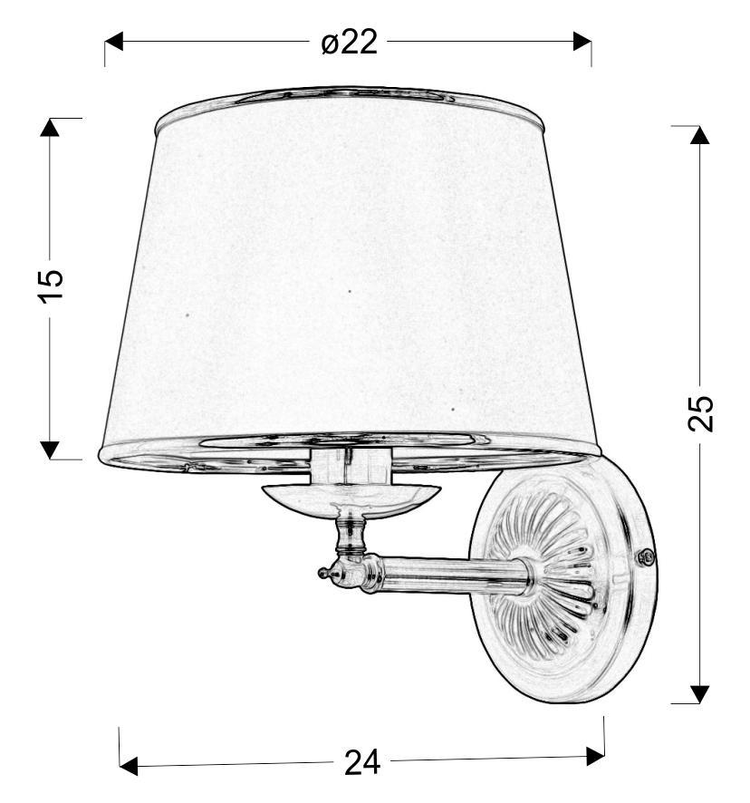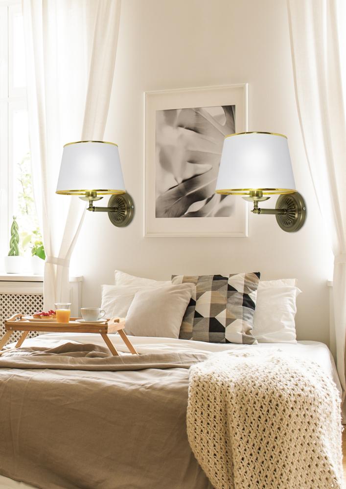 klasyczne połączenie patynowej podstawy z jasnym abażurem z tkaniny, zdobionym wypukłym obrzeżem w kolorze zunifikowanym z podstawą; idealny do wnętrz domowych jak i hotelowych z tradycyjnym wystrojem;