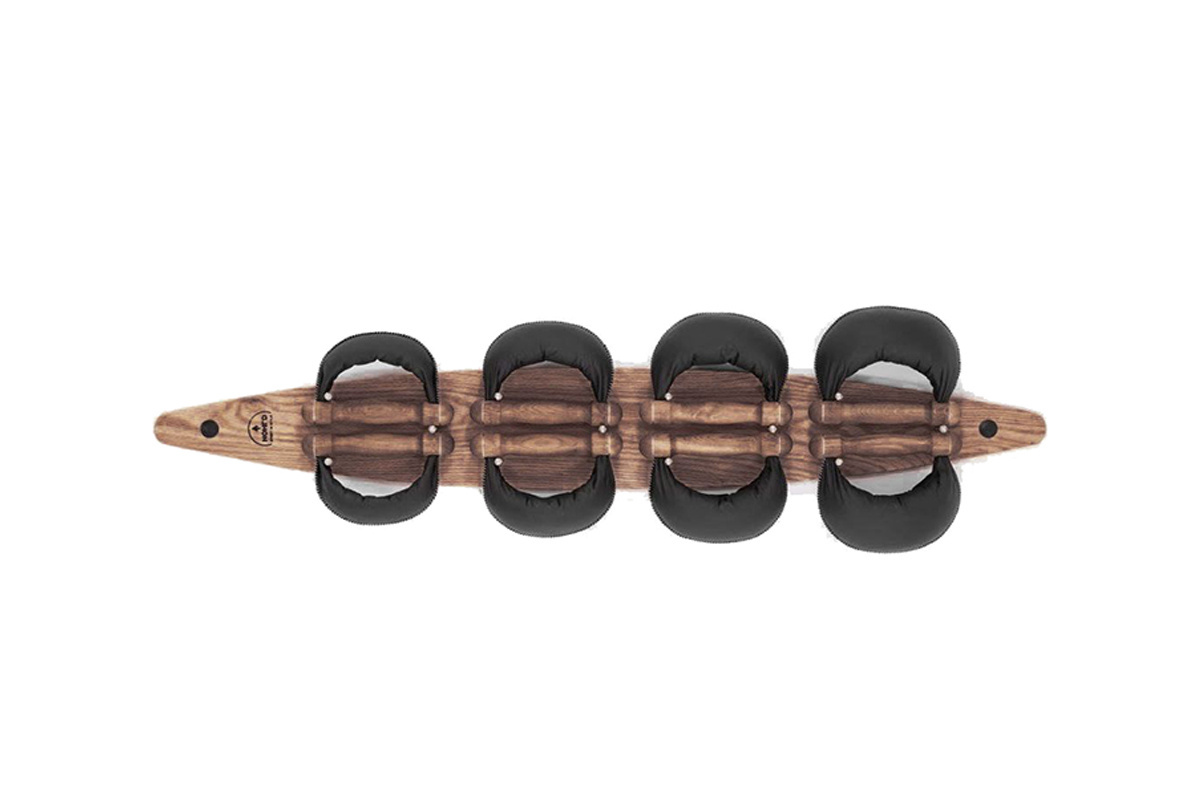 Tablica z hantlami SwingBell została wykonana z litego drewna i może pomieścić osiem hantli, czyli kompletny zestaw. 4 pary skórzanych hantli jest zawieszone na wspornikach z najwyższej jakości stali nierdzewnej. Uchwyty do hantli również zostały wykonane z litego drewna.