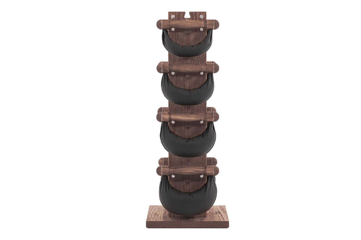 Stojak na hantle SwingBell został wykonany z litego drewna i może pomieścić osiem hantli, czyli kompletny zestaw. Na szczycie stojaka znajduje się uchwyt na tablet lub smartfon – dzięki któremu możesz ćwiczyć oglądając filmy treningowe lub postawić oficjalny zestaw ćwiczeń podczas treningu.