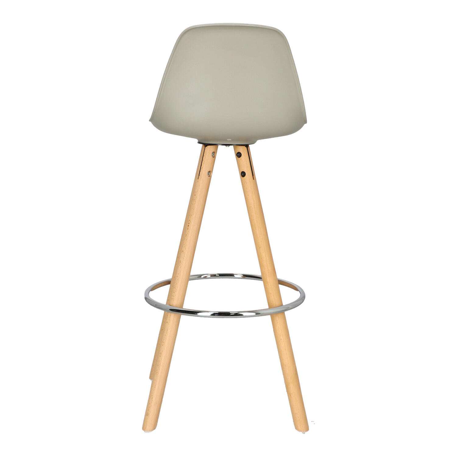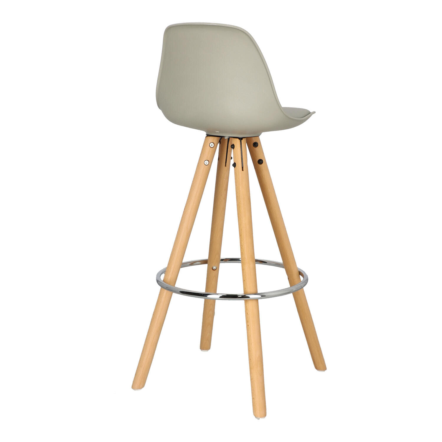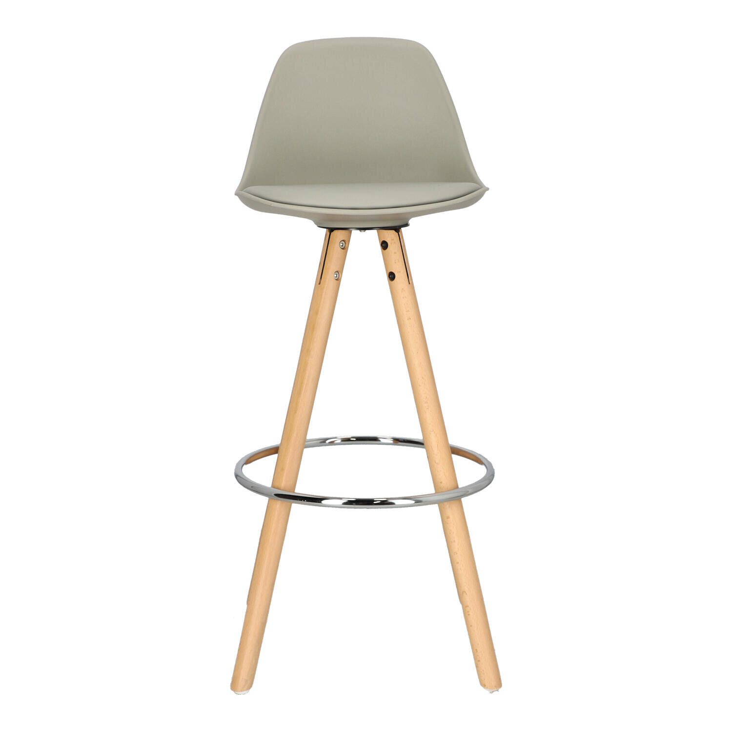 Podstawa stołka to drewniane bukowe nogi, które otacza metalowa, chromowana obręcz. Stabilne nogi łączą się z siedziskiem w jednym centralnym miejscu. Siedzisko wykonane z polipropyleniu dla wygody użytkowania wyposażone zostało w poduszkę z eko-skóry. Poduszka przyczepina został na stałe.
