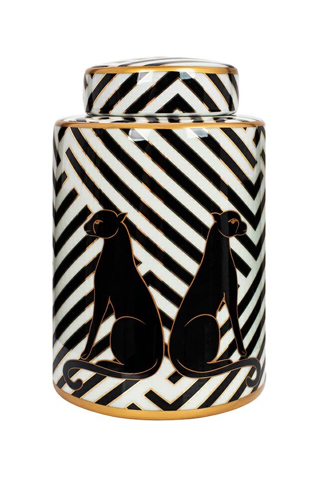 Porcelanowy słoik z ręcznie malowanym wzorem dwóch panter ozdobi i ożywi nawet najsurowsze wnętrze.