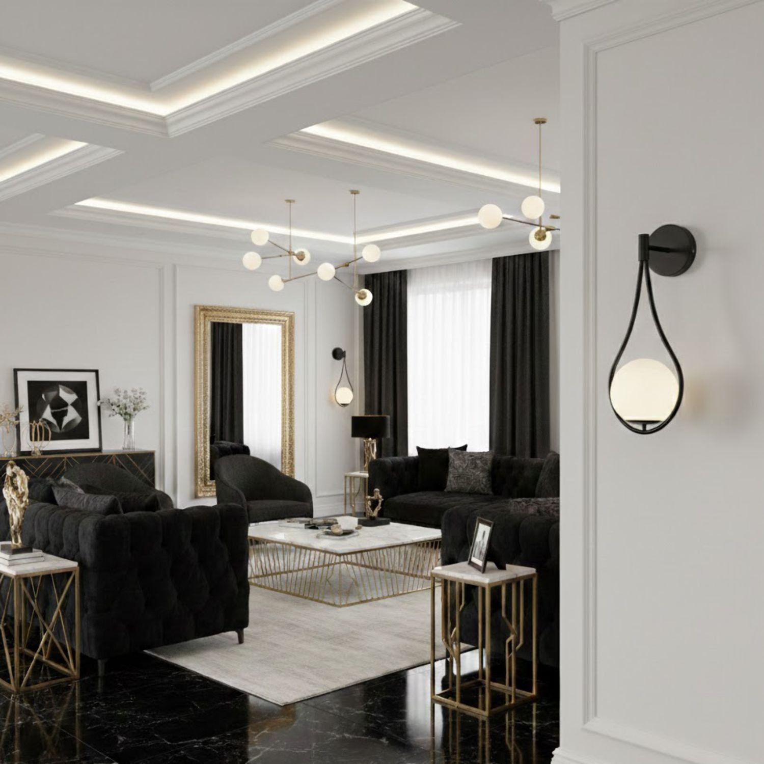 Metalowa konstrukcja w kolorze czarnym, nadaje oprawie elegancki, reprezentacyjny charakter, a matowy, mleczny klosz skutecznie rozprasza światło, ograniczając efekt olśnienia. Kinkiet zapewnia komfortowe oświetlenie pomocnicze oraz akcentowe w przestrzeniach użytkowych.