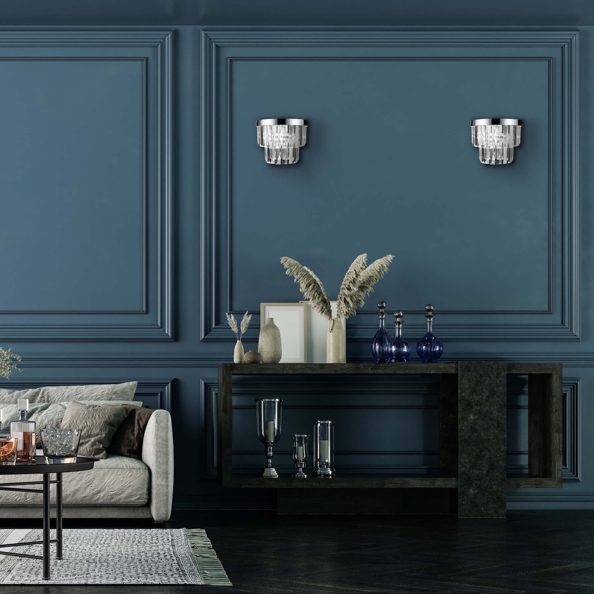 Vetro kinkiet – przedstawiamy państwu przepiękną, luksusową lampę. Ten szklisty, transparentny klosz, którego elementy przypominają strugi deszczu, jest pięknie wbudowany w metalowy stelaż. Ten modny design, posiada jedno źródło światła, które pięknie mieni się wśród szklanych elementów klosza. Niewątpliwie, posiadaniem takiego modelu powinni zainteresować się miłośnicy nowoczesnych wnętrz. Transparentność sprawia, że lampa ta uszlachetni niejedno pomieszczenie. Z pewnością, dzięki bogatemu wyglądowi, odnajdzie się także w komercyjnych miejscach, takich jak: pałacowe sale weselne czy muzea.
