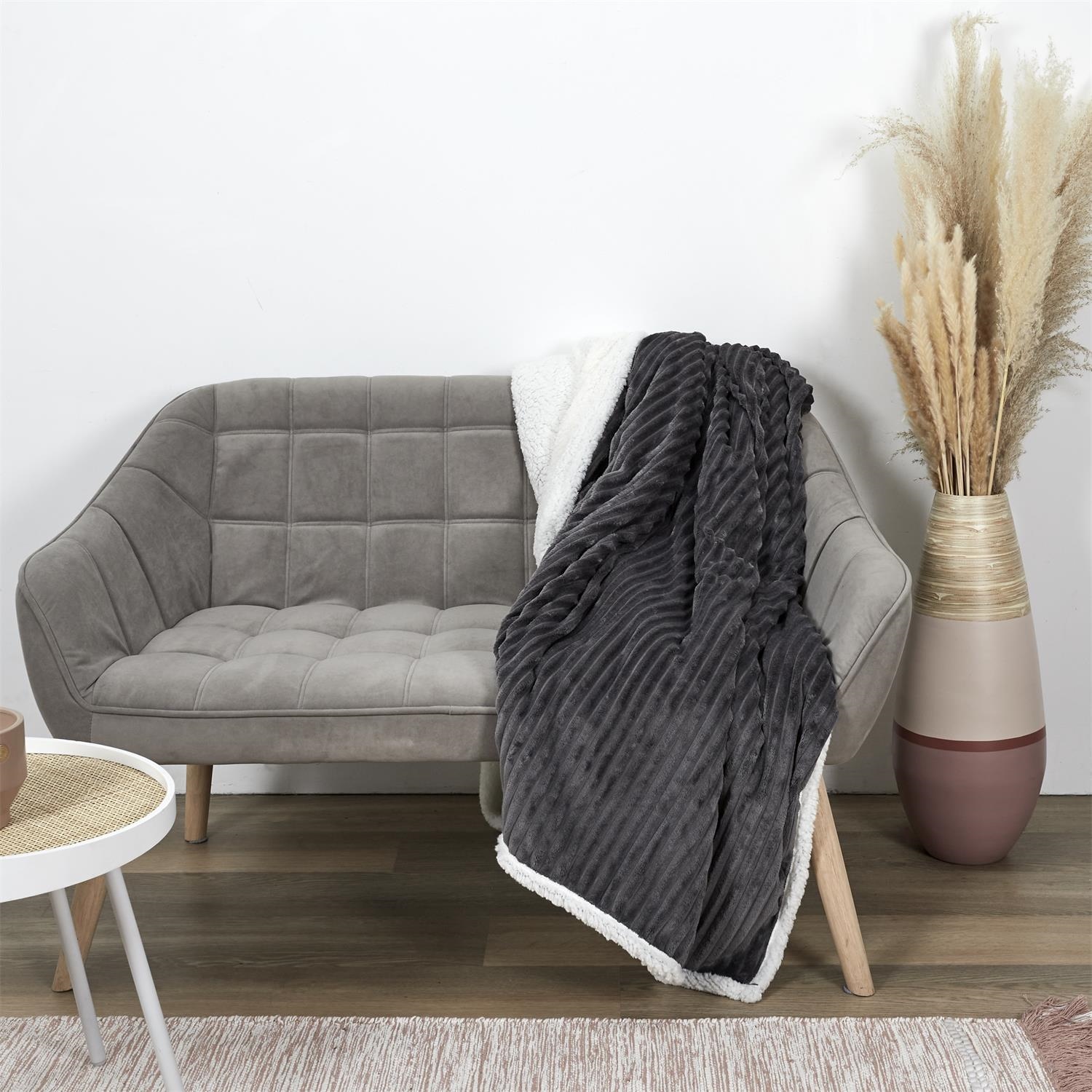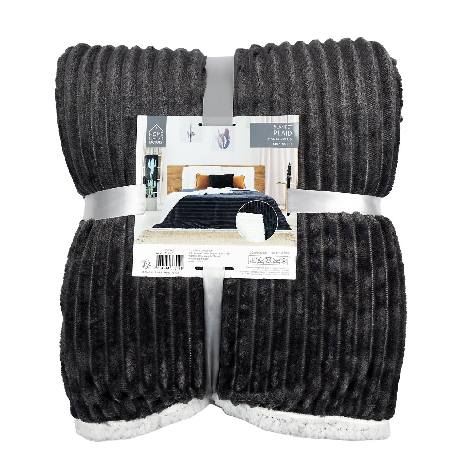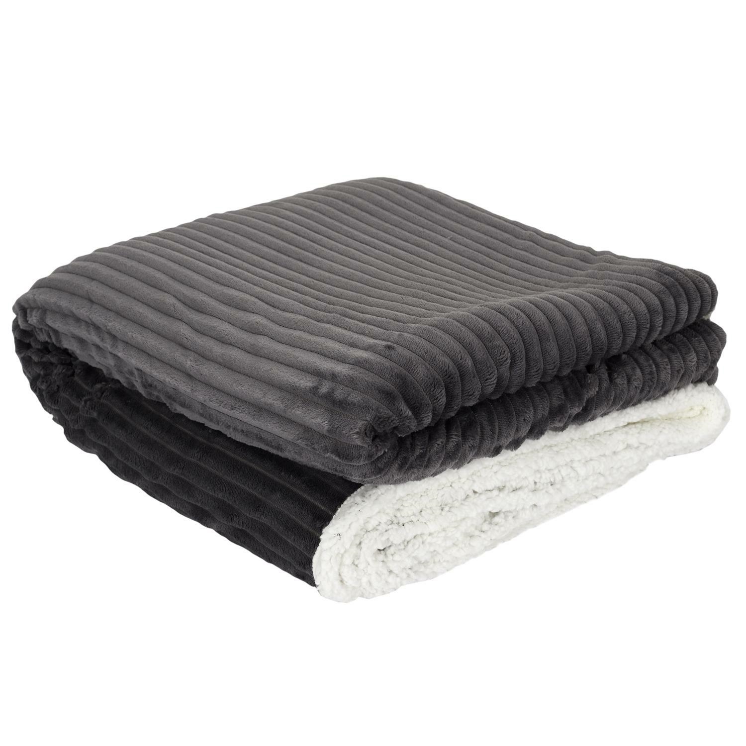 Bardzo gruby koc Sherpa z szarej prązkowanej tkaniny, obszyty został z drugiej strony białą miękką pluszowa tkaniną. Uzycie grubych i ciepłych materiałów sprawia, że koc jest bardzo gruby aż 6cm a przez co daje dużo ciepła i miękkości. Koc sprawdzi się jako okrycie podczas chłodnego wieczoru ale może być również zabezpieczeniem podłogi bla bawiących się dzieci.