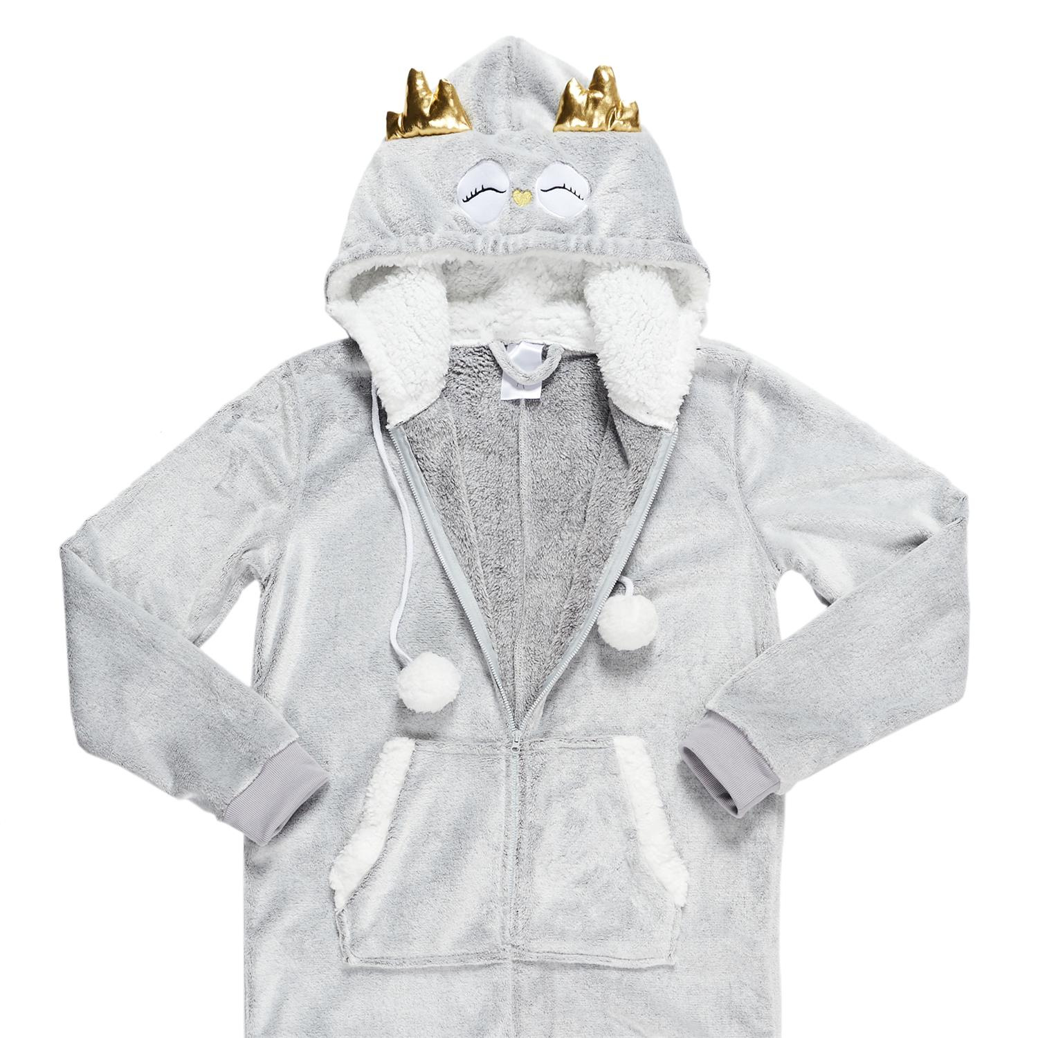 Kombinezon Onesie Sowa to pluszowy kombinezon z kapturem, idealny na zimowe wieczory lub relaks w domu. Jest wykonany z miękkiego, szarego materiału, który zapewnia ciepło i wygodę. Kombinezon ma długie rękawy oraz nogawki, a także praktyczny zamek błyskawiczny na całej długości, co ułatwia zakładanie.
