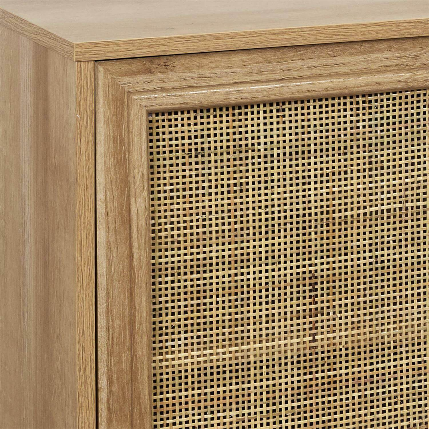 Trzydrzwiowa komoda Bali to mebel z plecionymi frontami szafki w stylu boho. Podstawą komody jest 5 nóg, które dzięki swojej budowie gwarantują stabilizację. Dodatkowa piąta noga podpiera komodę pośrodku, dzięki czemu możemy śmiało ułożyć w niej ciężką porcelanę lub sztućce. Trzydrzwiowa niska komoda Bali będzie najpiękniejszym meblem w Twoim wnętrzu! – Główny skład: płyta wiórowa.