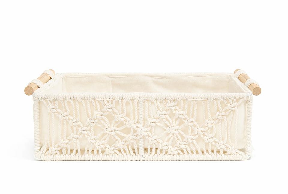 Miękka tkanina sprawia, że całość prezentuje się lekko i harmonijnie, a drewniane uchwyty podkreślają naturalny wygląd koszyka.