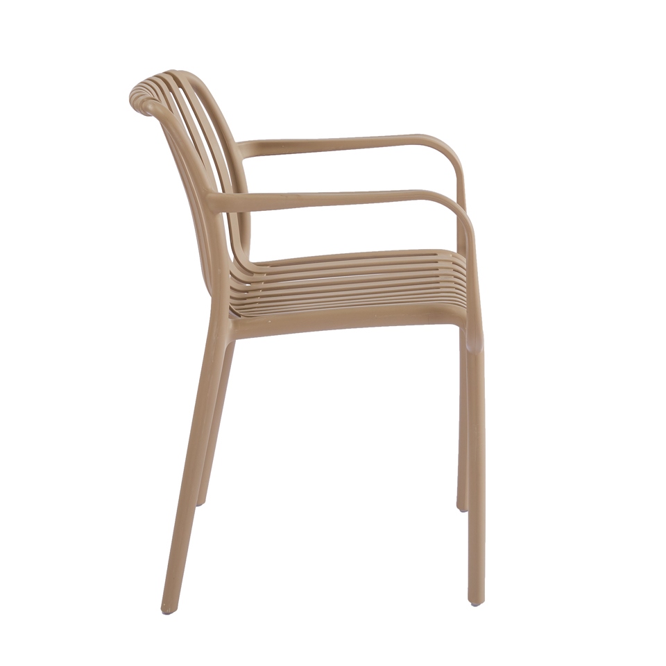 Krzesło STRIPS ARM beżowe wykonano z wysokiej jakości tworzywa sztucznego, które jest odporne na wilgoć, promieniowanie UV i codzienne użytkowanie. Dzięki temu krzesło zachowuje swój intensywny kolor i kształt nawet po wielu miesiącach eksploatacji na tarasie lub w ogrodzie.