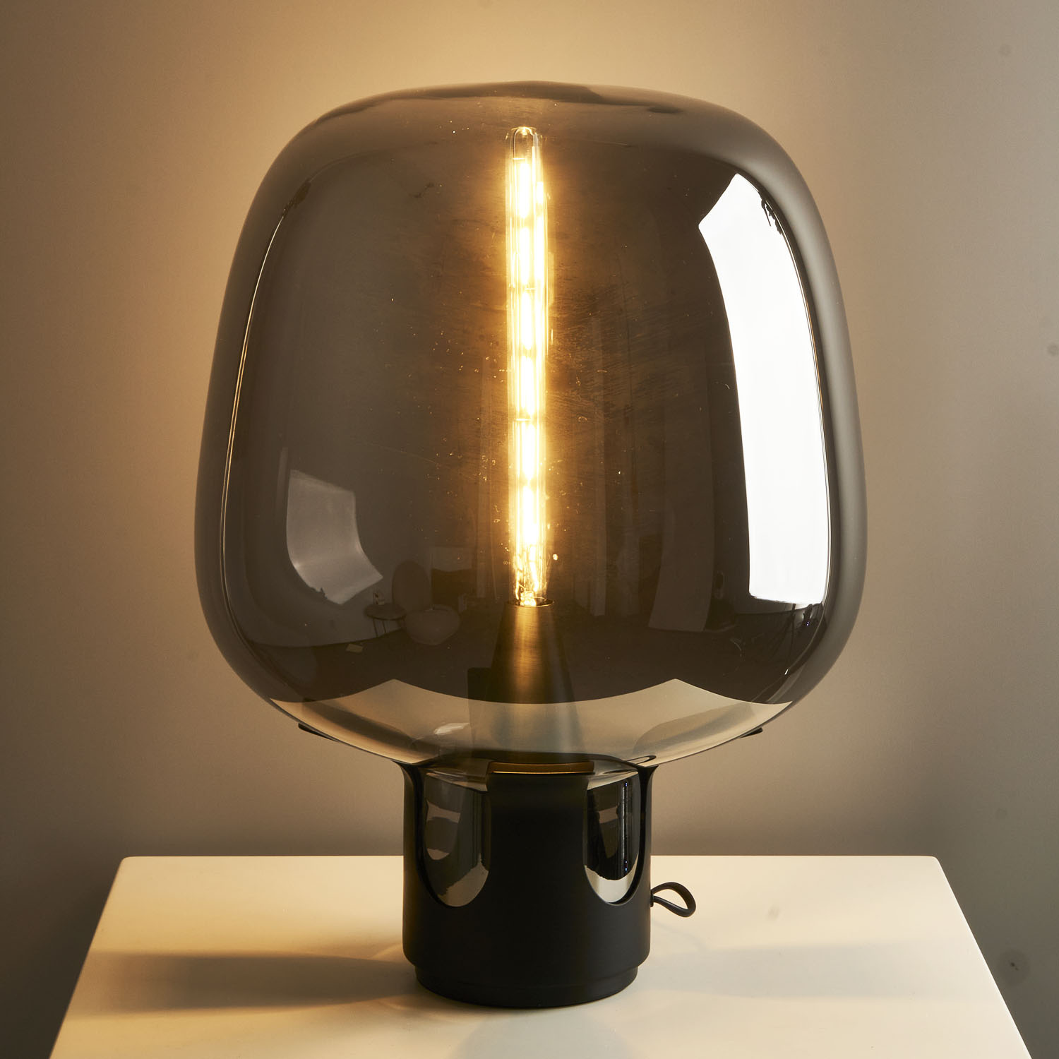 Lampa stołowa FATA z dużym kloszem z przydymionego szkła i metalową podstawą to elegancki i nowoczesny dodatek do każdego wnętrza. Jej unikalny design, łączący w sobie delikatność szkła z solidnością metalowej podstawy, nadaje pomieszczeniu subtelnego charakteru.