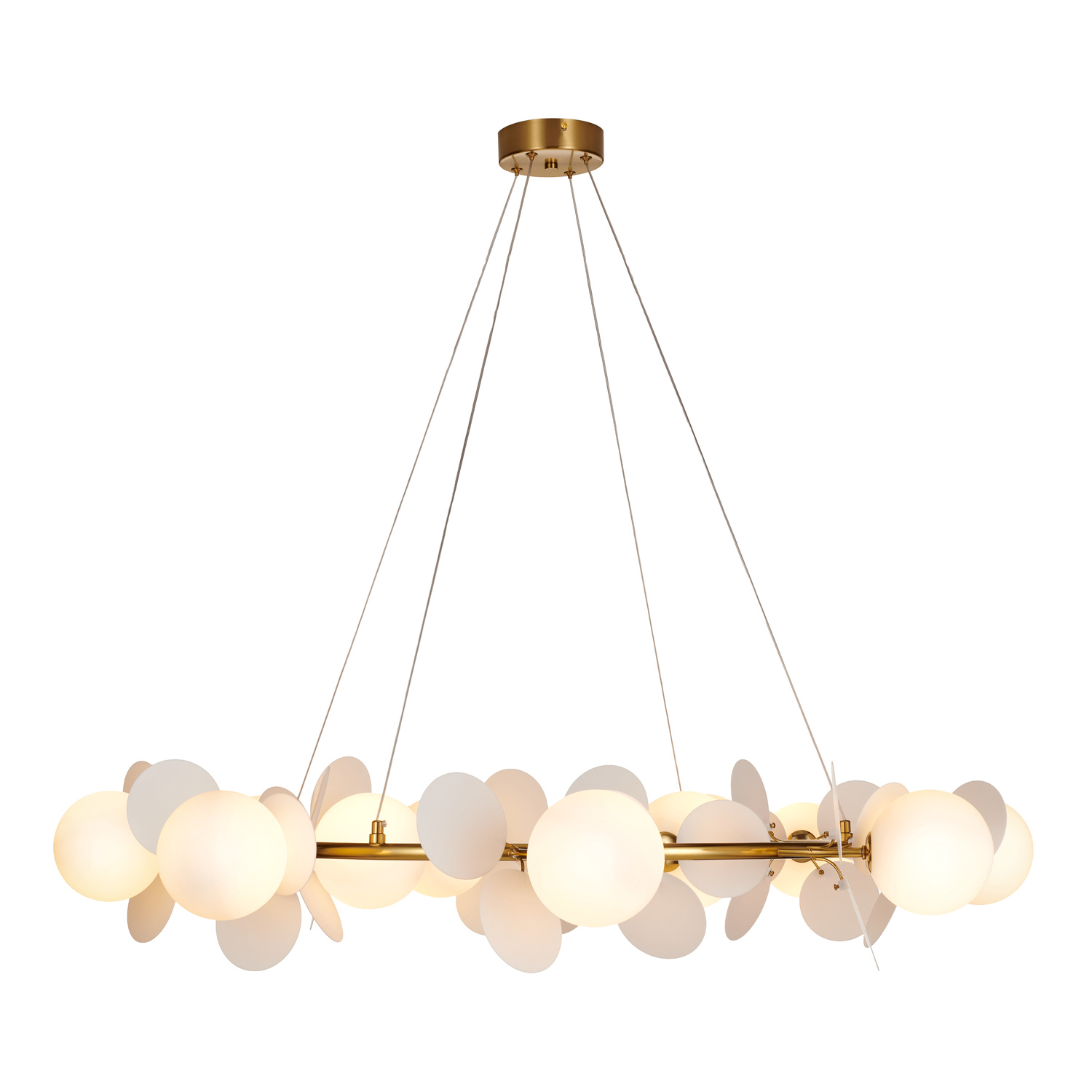 Żyrandol zawieszony jest na ciennych linkach przymocowanych do złotej, okrągłej podsufitki.