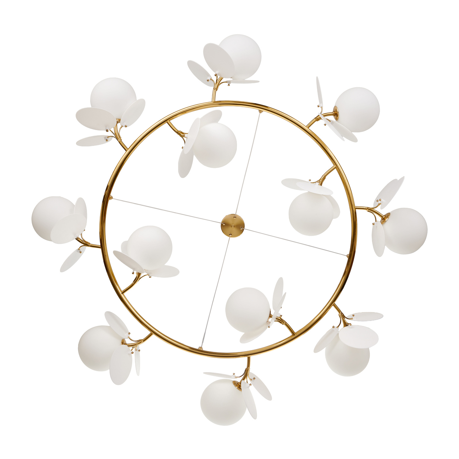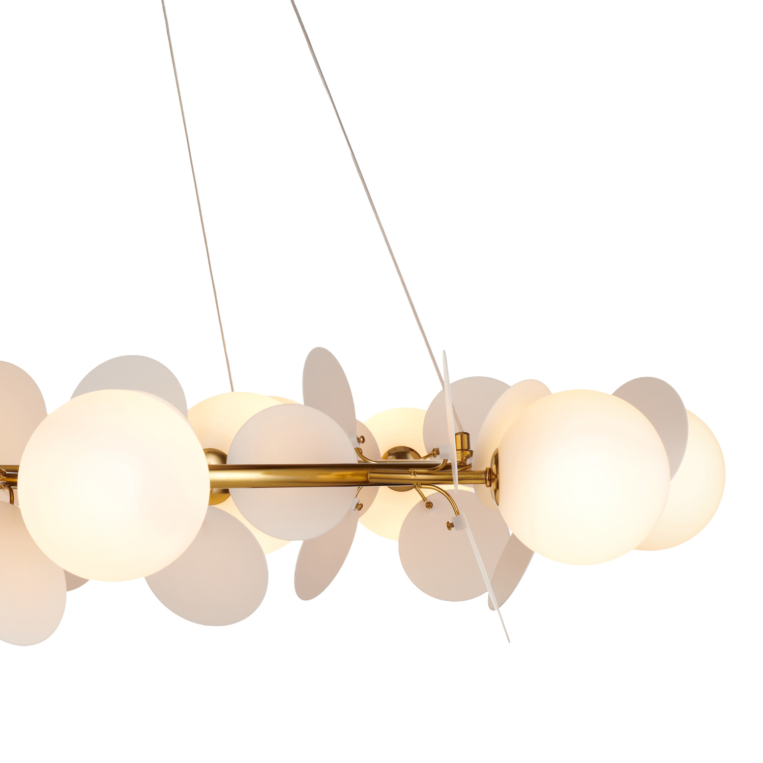 Te płatki są przymocowane do złotej obręczy oraz w pobliżu białych kloszy, dodając lampie luksusowego charakteru.