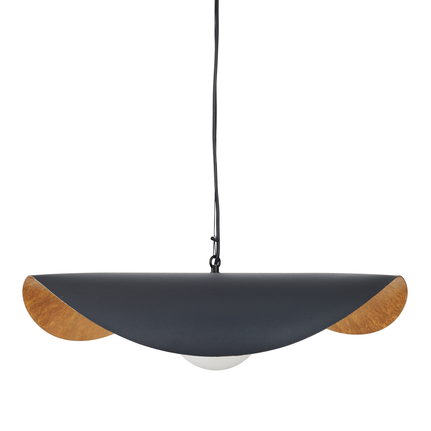 Czarny korpus i podsufitka nadają lampie nowoczesny i nieco surowy, industrialny wygląd, który jest idealnie przełamany połyskującą złotą powłoką wewnętrznego klosza.