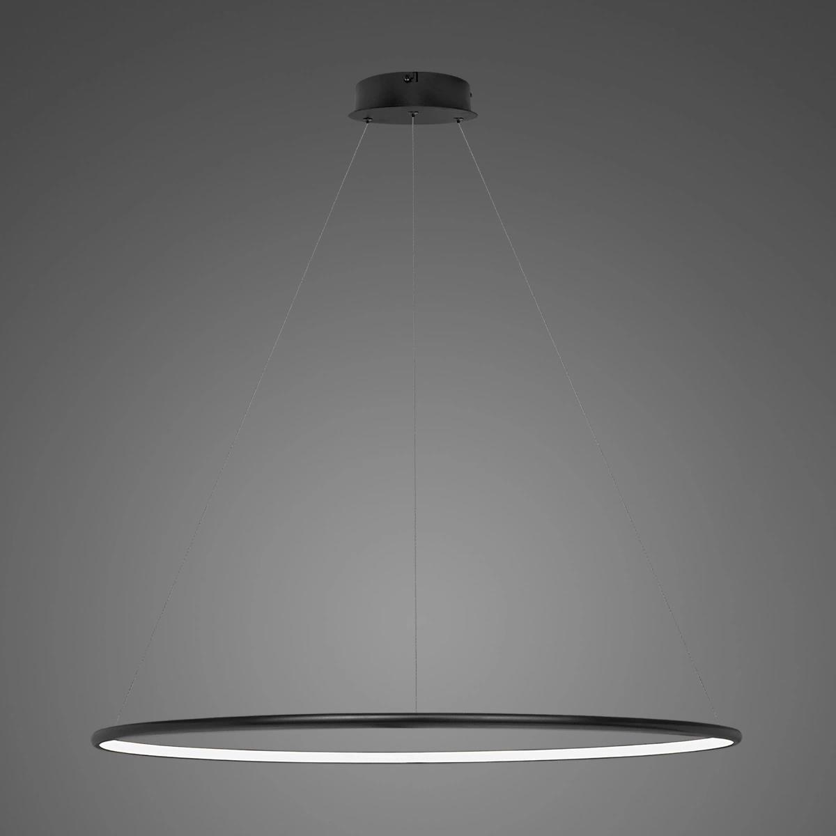 Nowoczesna lampa LED w kształcie okręgu, czarna, z możliwością ściemniania DALI, ciepłe światło 2700K, wysoka jakość CRI>90, regulowana wysokość.