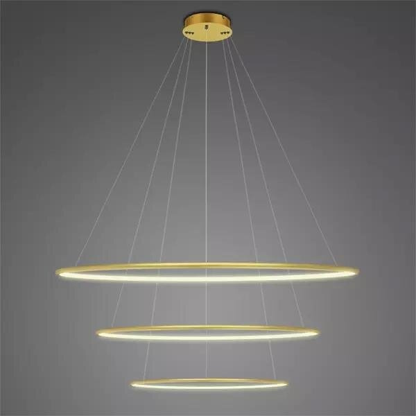 Nowoczesna lampa LED w złotym kolorze, 3 okręgi, regulowana wysokość, ściemnianie DALI, CRI>90, ciepłe światło 3000K, trwałe aluminium.