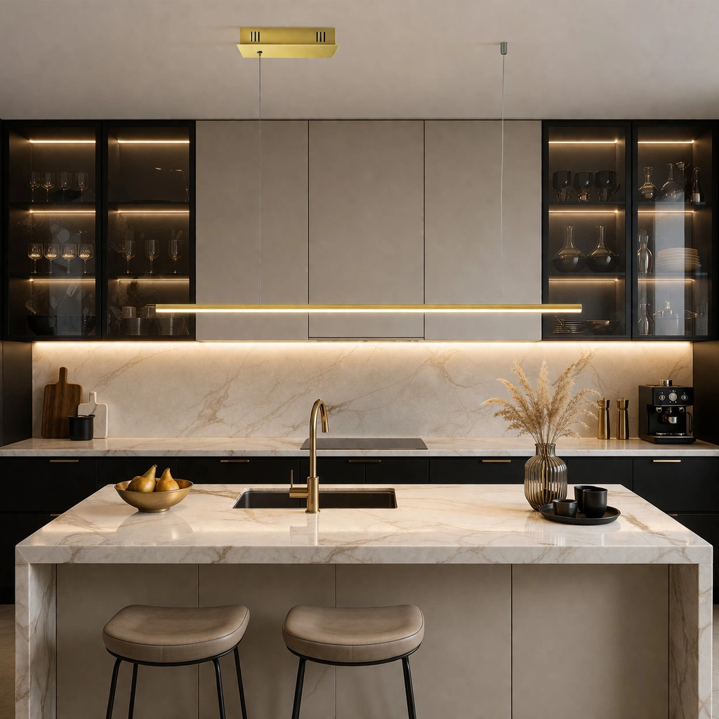Złota lampa wisząca LED 100 cm, ściemniana DALI, ciepłe światło 3000K, nowoczesny design, aluminium, wysoka jakość CRI>90, regulowana wysokość.
