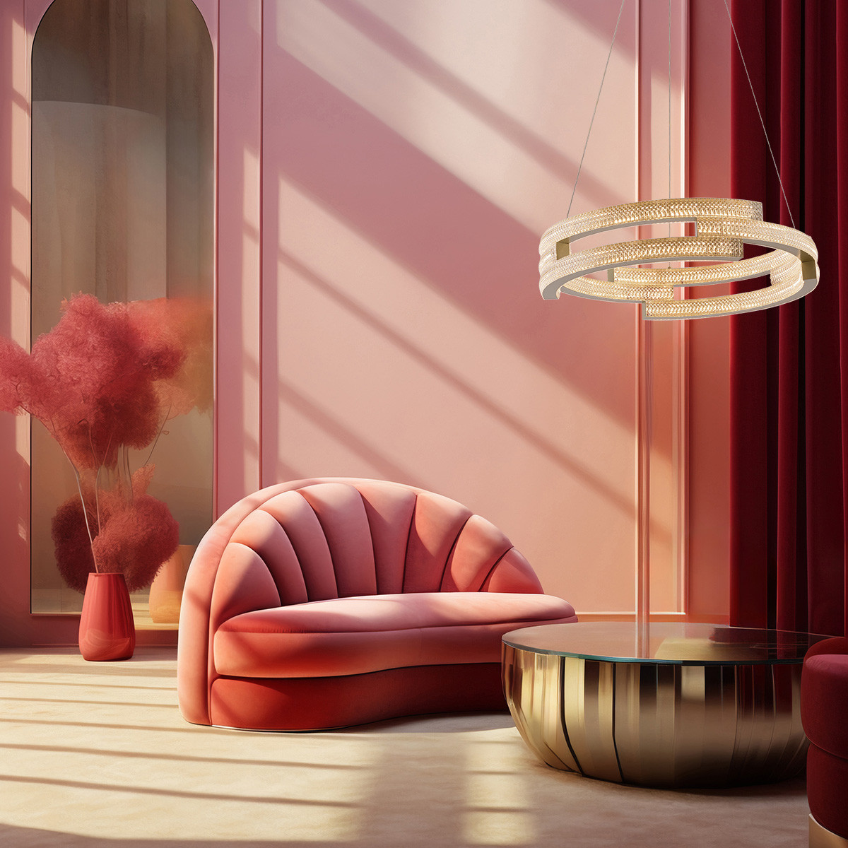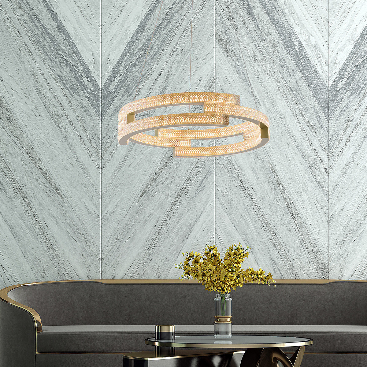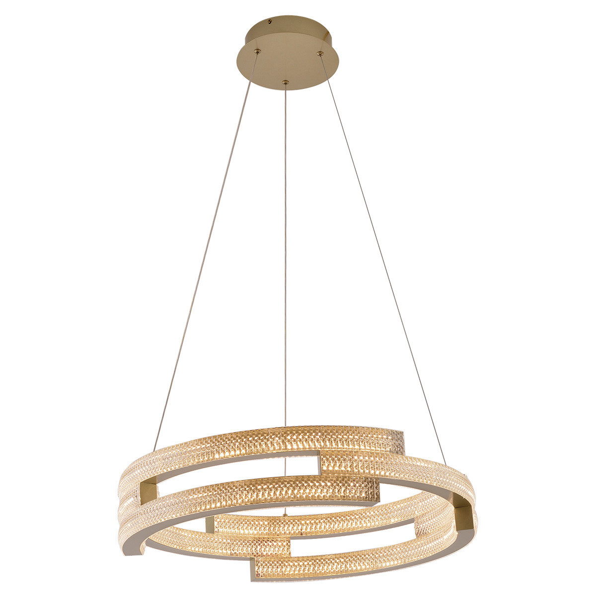 Lampa wisząca Tarja została wykonana z metalu w złotym kolorze z elemntami akrylu imitującego kryształ. Lampa stanowi niezwykle ozdobny element dekoracyjny. Ze względu na swoje imponujące rozmiary będzie doskonałym wyborem do dużych, przestronnych pomieszczeń takich jak salon, sypialnia, jadalnia. Kształt i kolorystyka lampy sprawiają, że lampa ta bedzie idealnym wyborem do wnętrz w nowoczesnym stylu, stylu glamour oraz modnym aktualnie modern classic. Lampa posiada wbudowane światło LED o zmiennej barwie światła. Barwę światła ustawia się przed montażem w podsufitce lampy. Do wyboru mamy ciepłą, neutralną lub zimną barwę światła.