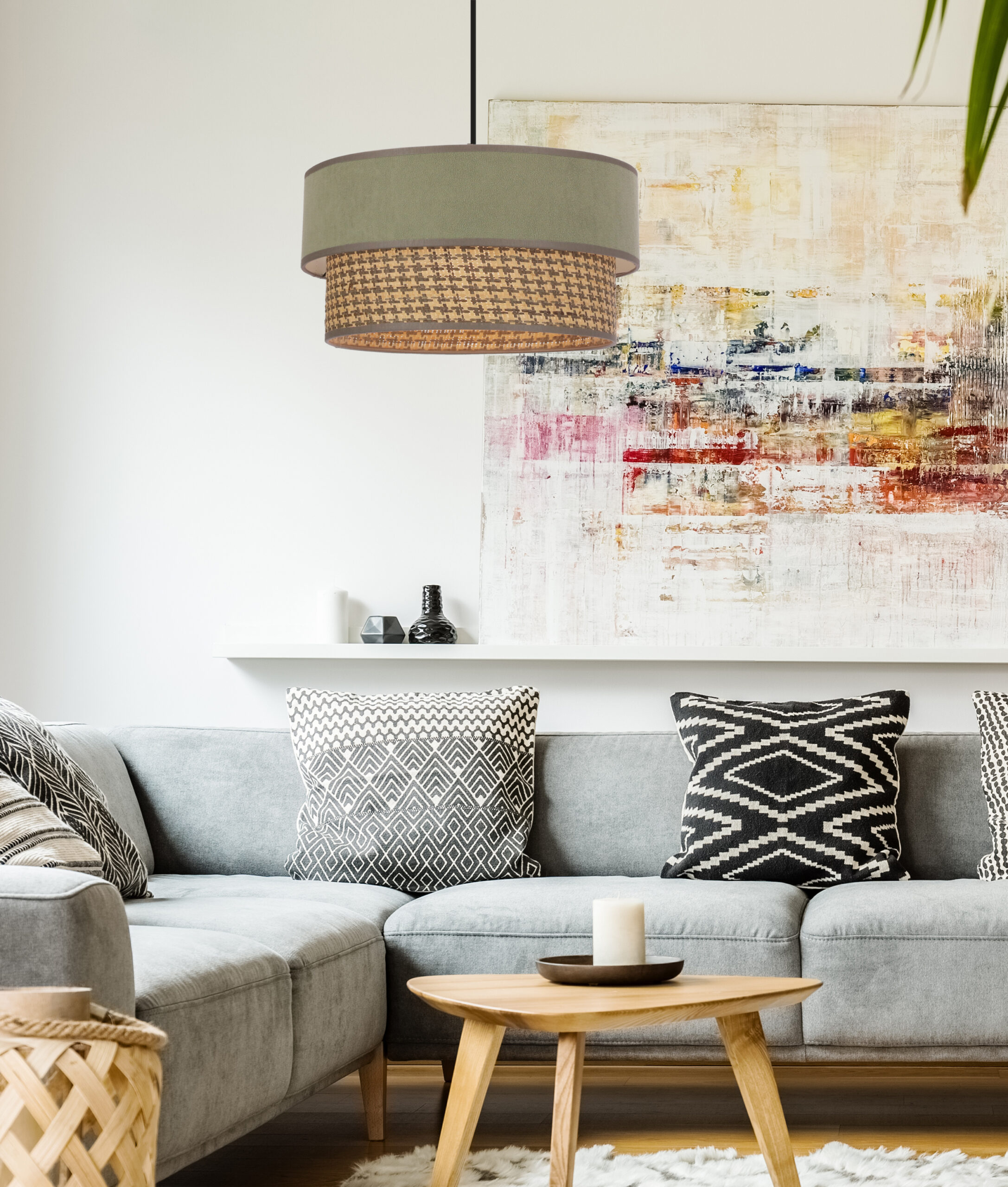 Materiał: zawiesie stalowe, abażur tkanina+fornir, przewód w bawełnie