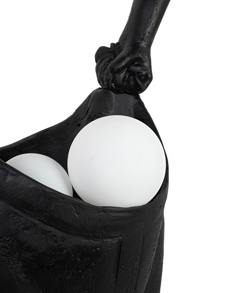 Centralnym punktem są szklane klosze, subtelnie ukryte w „spodniach” figury, które nadają zaskakujący, artystyczny wyraz.