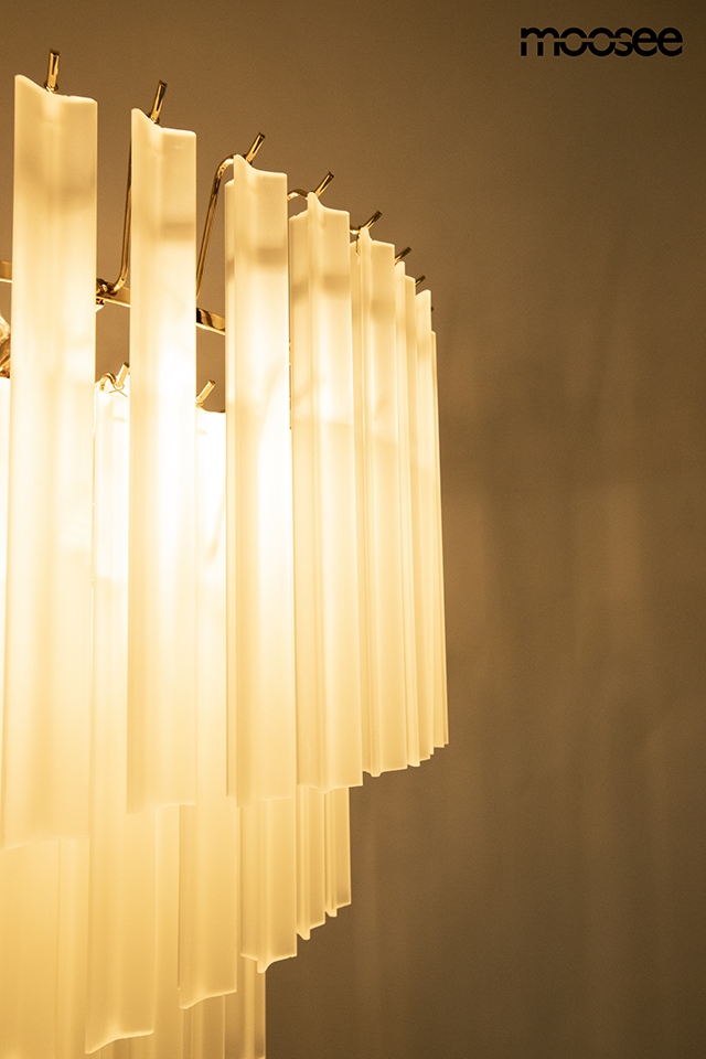 Wykonana ze stali, z kloszami z mlecznobiałego, matowego szkła, lampa subtelnie rozprasza światło, wprowadzając do wnętrza ciepły i przytulny nastrój.