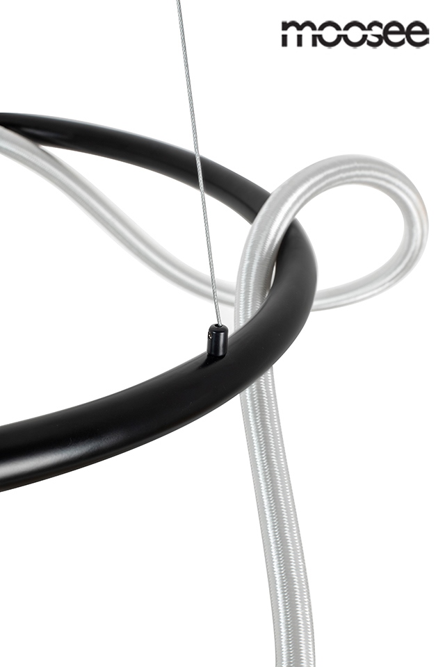 MOOSEE lampa wisząca SERPIENTE 60 czarna. Okrągły, metalowy stelaż w kolorze czarnym przepleciony elastycznym wężem w oplocie z tkaniny, który skrywa ledowe źródło światła. Kontrastowe połączenie czerni z bielą świetnie odnajdzie się w subtelnych, eleganckich oraz nowoczesnych wnętrzach. Światło: LED 35 W / 2800 lm / 3000 K Oprawa: wys. 265 cm / szer. 65 cm / gł. 65 cm Obręcz: śr. 60 cm / gr. 3,5 cm Mocowanie: śr. 15 cm / wys. 6 cm Przewód LED: gr. 2,5 cm / dł. 200 cm Przewód: 200 cm Montaż: instalacja sufitowa Waga netto: 3,92 kg Wymiary opakowania: 66 cm / 66 cm / 11 cm.