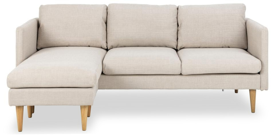 Każdy dom zasługuje na wygodną i praktyczną sofę, taką jak ta. Jest wyposażona w sprężyny kieszeniowe dla większego komfortu i szezlong. W tym przypadku nie musisz wybierać strony – możesz zmienić stronę, jak chcesz, dzięki stałemu odwracalnemu szezlongowi. Sofa jest tapicerowana beżową tkaniną z efektem dwukolorowym, co nadaje jej ładny wygląd. Lekki, nowoczesny wygląd zapewniają stożkowe drewniane nóżki w kolorze dębu.