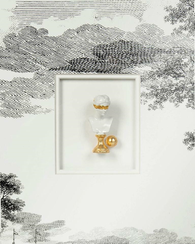 W centrum kompozycji umieszczono rzeźbę kobiety ze złotym akcentem, która dodaje nowoczesnego charakteru i przyciąga uwagę.