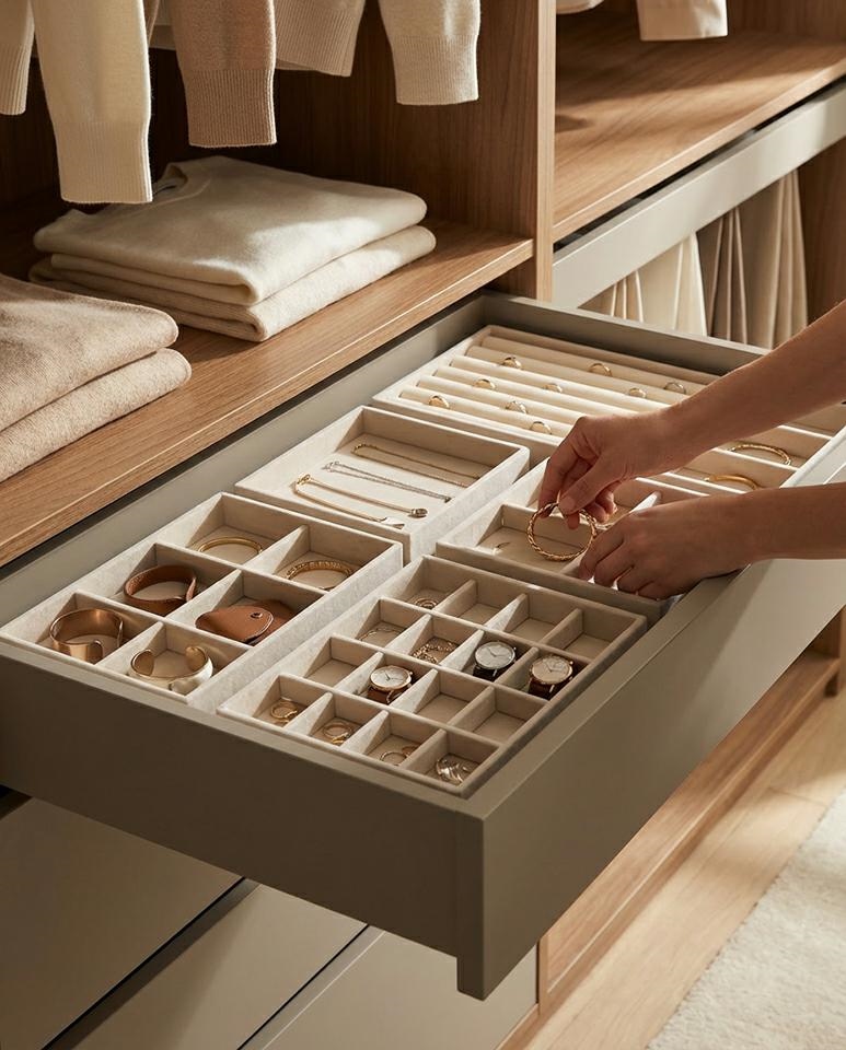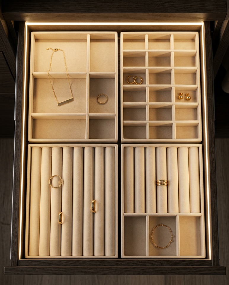 Przemyślany układ przegródek umożliwia wygodne przechowywanie pierścionków, kolczyków, bransoletek oraz naszyjników, zapewniając szybki dostęp do każdego elementu. Modułowa forma pozwala dowolnie dopasować konfigurację organizerów do własnych potrzeb i wielkości szuflady.
