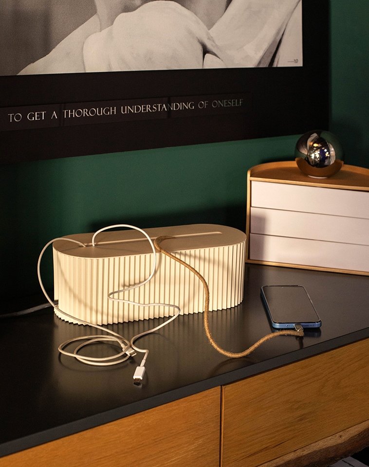 Szary organizer na przedłużacze i kable to elegancki i praktyczny sposób na utrzymanie porządku wokół kabli codziennego użytku.