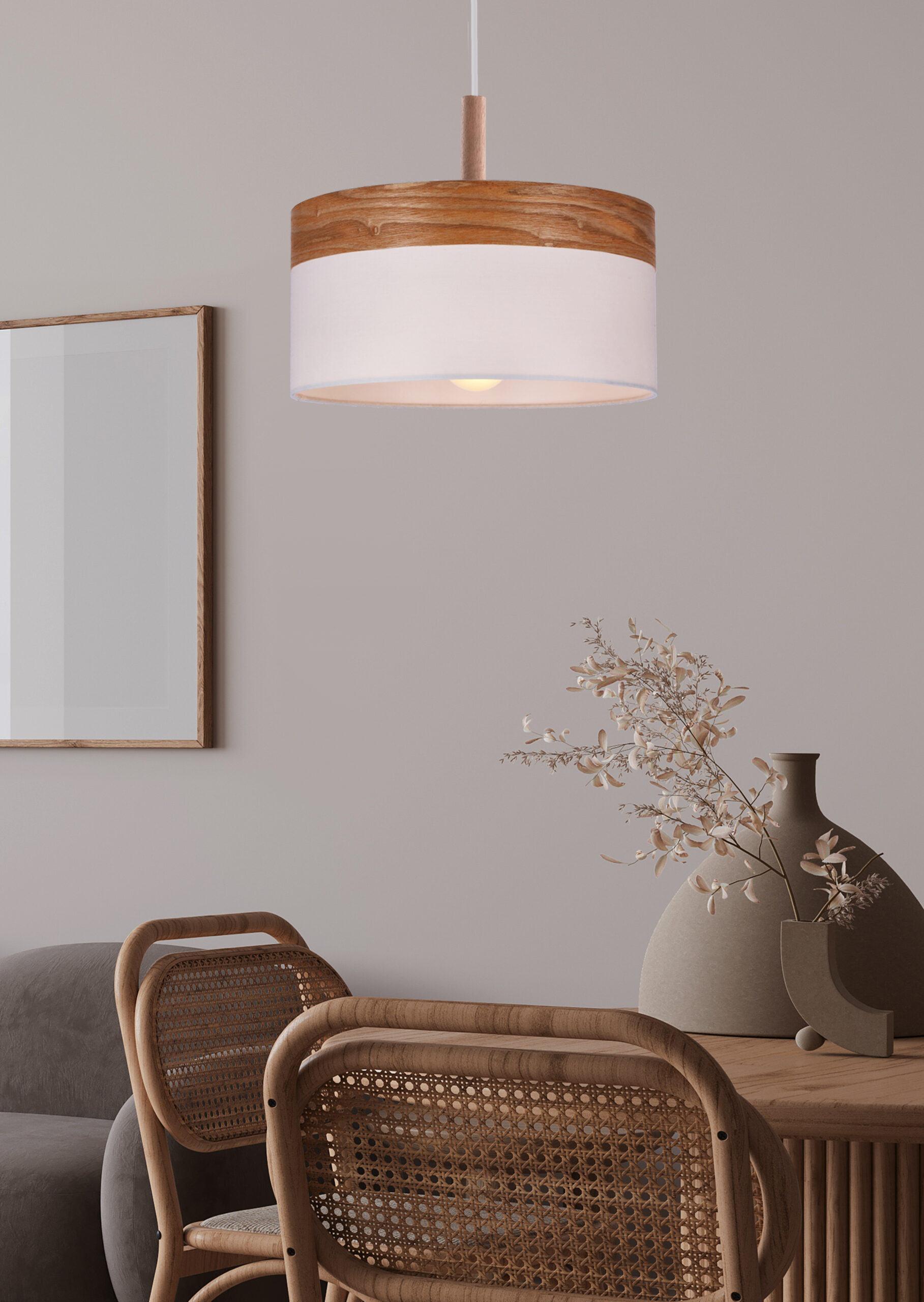 Materiał: zawiesie stalowe+drewno, abażur tkanina+fornir