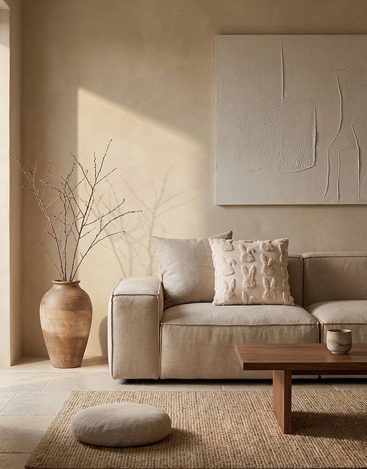 Beżowa tkanina została ozdobiona wypukłym wzorem króliczków, który nadaje poduszce wyjątkową strukturę i dekoracyjny wygląd.
