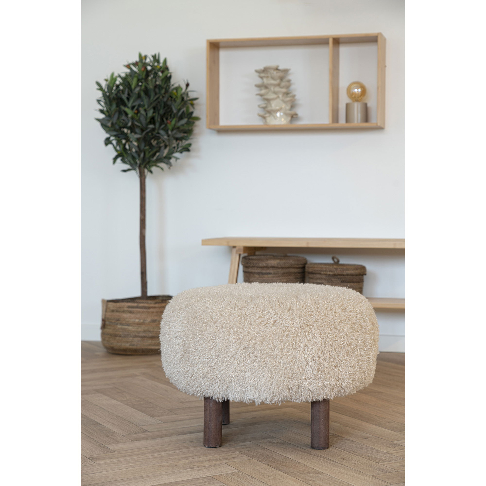 Okrągła pufa w tkaninie imitującej owczą skórę doda wnętrzu naturalnego, swojskiego klimatu. Mebel wykonany z sosnowych nóg lakierowanych na kolor ciemnobrązowy oraz siedziska w jasnej, beżowej tkaninie o długim miękkim włosiu. Pufa może być miejscem do siedzenia, gdyż jej maksymalne obciążenie to aż 110kg. Waga mebla 3,5kg. Nie wymaga montażu.