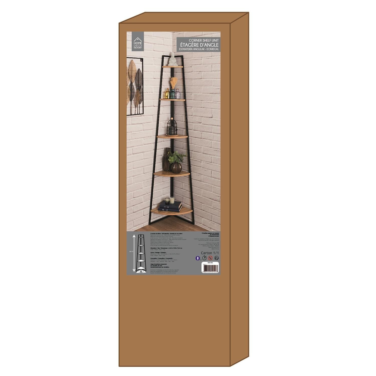 Regał Corner to narożny regał z zaokraglonymi półkami. Regał wyposażony w 5 półek sprawdzi się w przestrzeni w której ważne jest wykorzystanie najmniejszej wnęki. Półki regału wykonane zostały z płyty meblowe w okleinie imitującej drewno. Podstawa regału to metal malowany proszkowo na czarno. Wymaga montażu