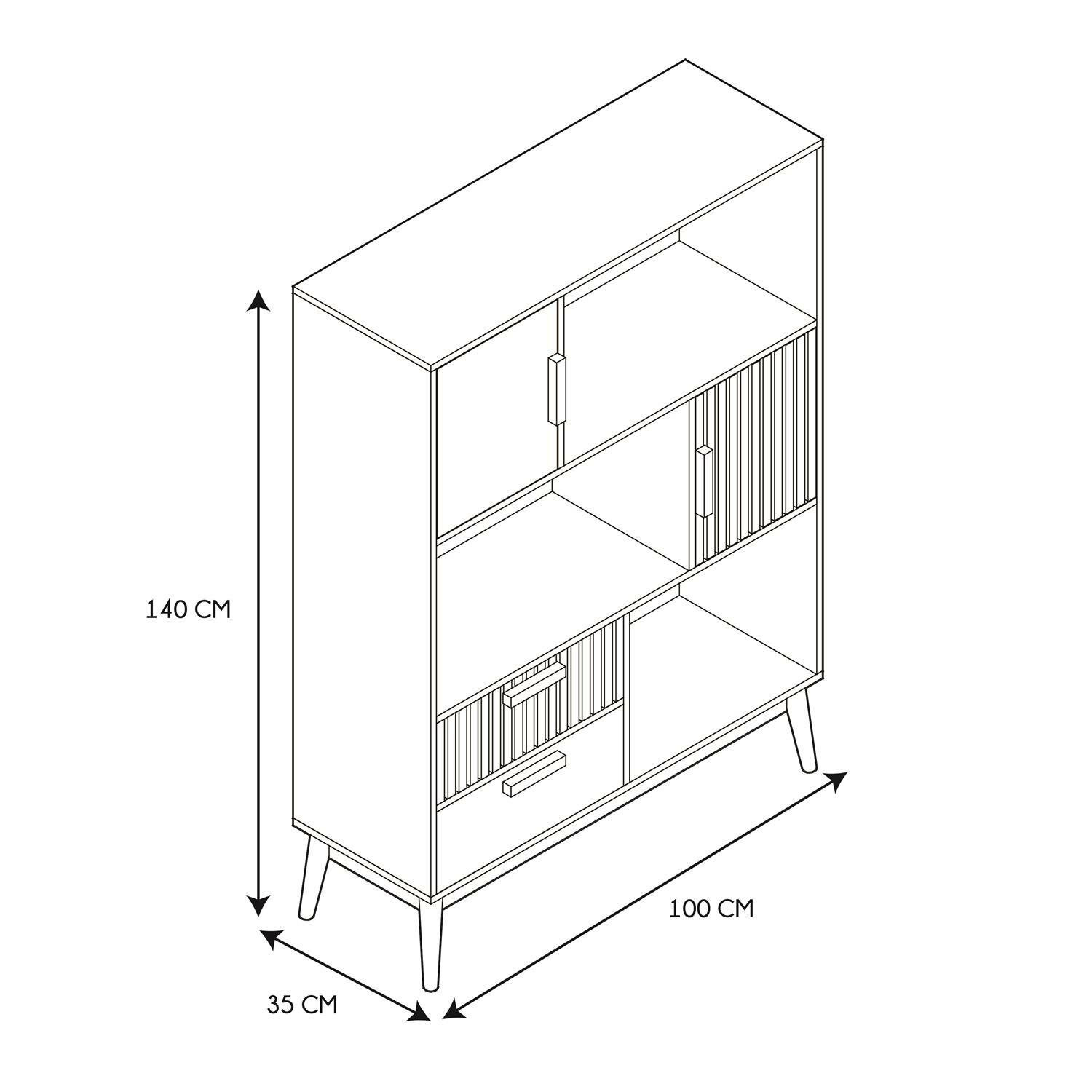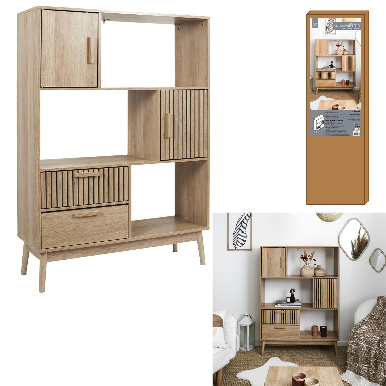 Regał Klaus to jeden z elementów serii Klaus, która charakteryzuje się naturalnym kolorem okleiny, mocnymi sosnowymi nogami i cekawym zdobieiem z elementami lameli. Regał wyposażony został w dwie szuflady oraz dwie szafki. Dodatkowo regał posiada 3 półki na których możemy ustawić np. książki. Frony regału są zarówno ozdobione lamelami jak i również dwa fronty są gładkie. Otwieranie szuflad i szafek umożliwiają drewniane uchwyty.