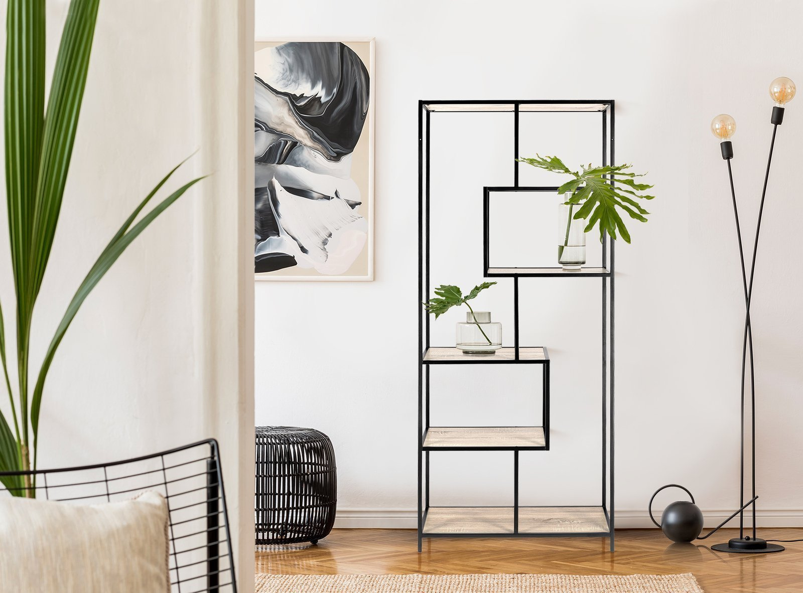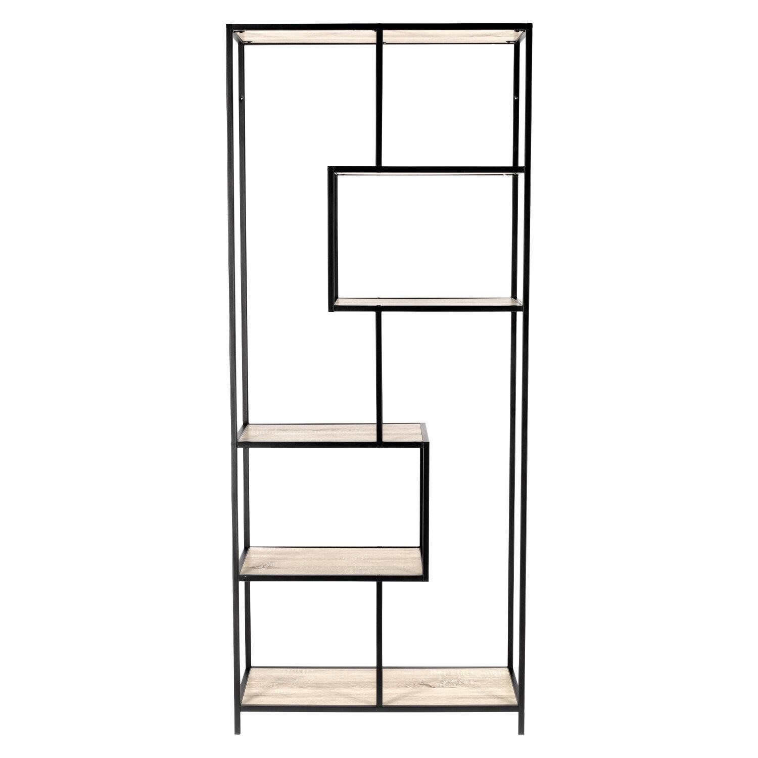 Regał Oxford II posiada kilka nieregularnie rozmieszczonych półek. Tworzą one ciekawy, asymetryczny wzór, który zwraca uwagę i pełni funkcję ozdobną.