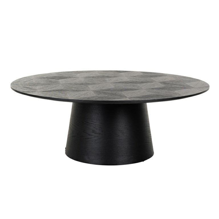 Stolik kawowy wykonano z szykownego forniru dębowego oraz sklejki o czarnym wykończeniu.